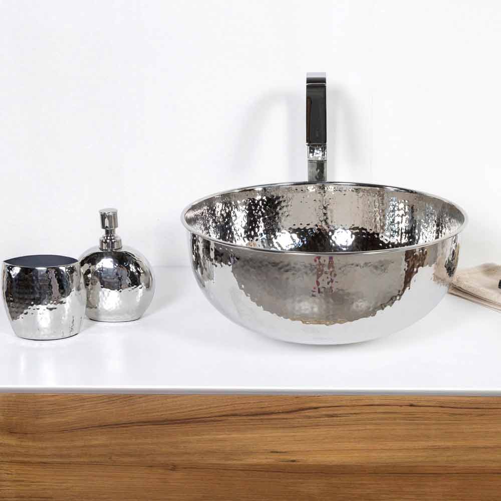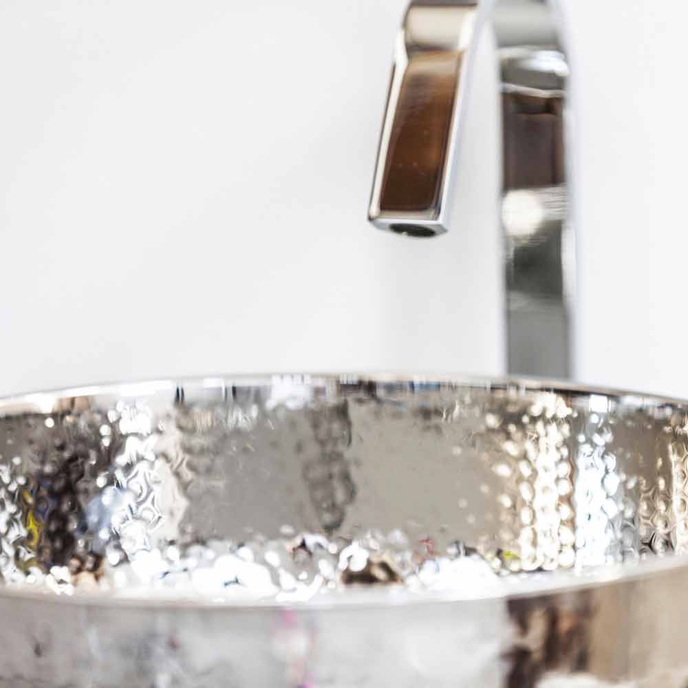 Fregadero moderno en latón cromado martillado . El borde superior curvado confiere al lavabo más resistencia y facilidad de limpieza.