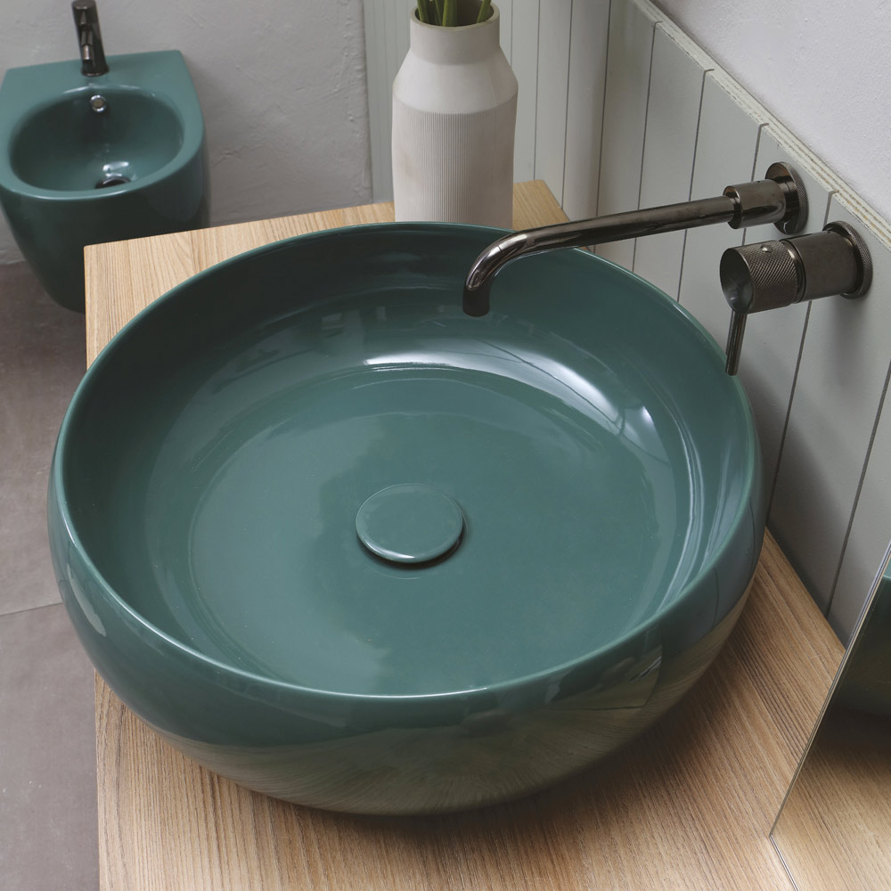 Lavabo sobre encimera redondo fabricado en Italia a través de una artesanía en cerámica de color brillante. Un mueble original y elegante que presenta un diseño marcado por líneas suaves y armoniosas que le dan al producto toda su personalidad contemporánea y su sabor moderno . Ideal para baños con muebles refinados y esenciales, este lavabo trae consigo un fuerte impacto escenográfico gracias a los maravillosos e insólitos colores propuestos que transforman su estética simple en una verdadera obra maestra.