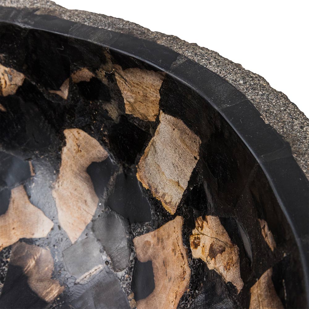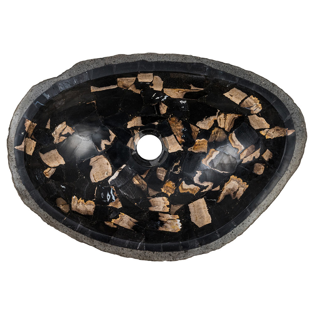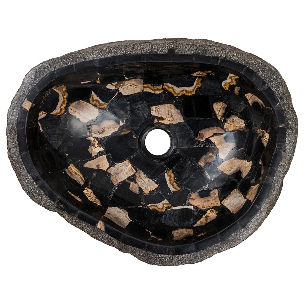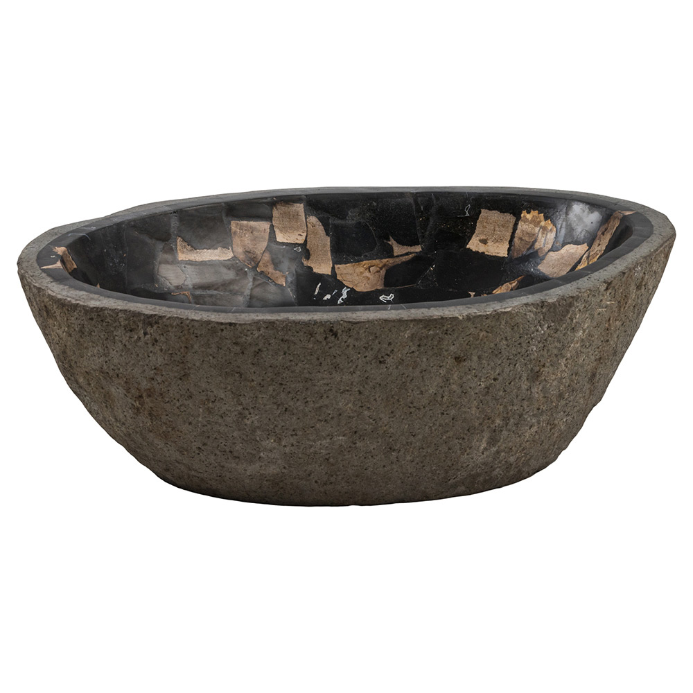Palizzi es un lavabo sobre encimera realizado a mano en piedra de río con un mosaico de piedra de ónix en su interior.