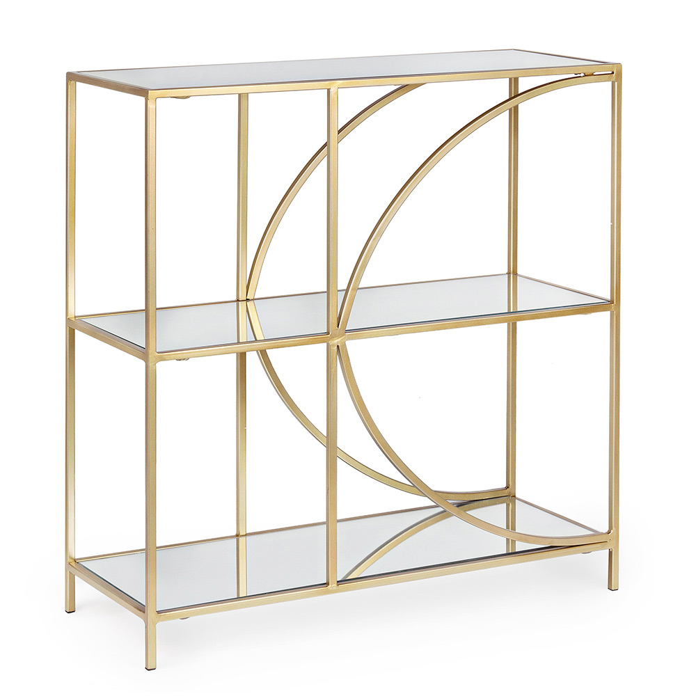 Librería baja autoportante de acero y 3 baldas de cristal de elegante diseño.