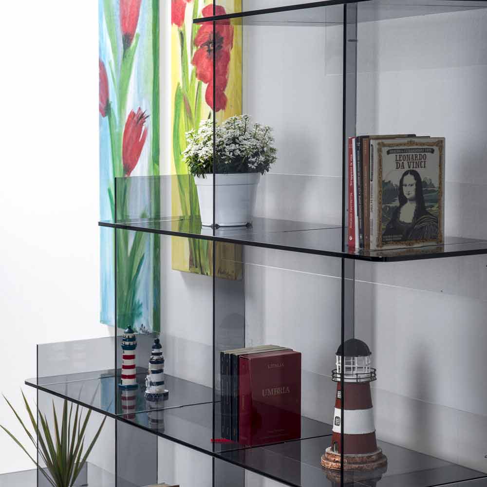 Biblioteca privada con líneas mínimas y el efecto de la suspensión en el vacío para los libros que lo proveen: solo los libros, de hecho, personalizan el entorno doméstico. La librería ahumada transparente SFERA3 nació como una biblioteca autoportante, pero es posible anclarla a la pared. Las características físico-técnicas del plexiglass (a prueba de golpes, indeformable, inalterable, aislante del calor) hacen que el producto sea adecuado tanto en el hogar como en el exterior. El brillo y el brillo se mantienen constantes y sin cambios a lo largo del tiempo. El plexiglás de PMMA de polímero virgen utilizado por es no tóxico, hipoalergénico, inodoro y antibacteriano. 100% reciclable Cumple con UNI EN 71-3: 200. Diseñado, diseñado y fabricado en Italia, con materiales italianos.