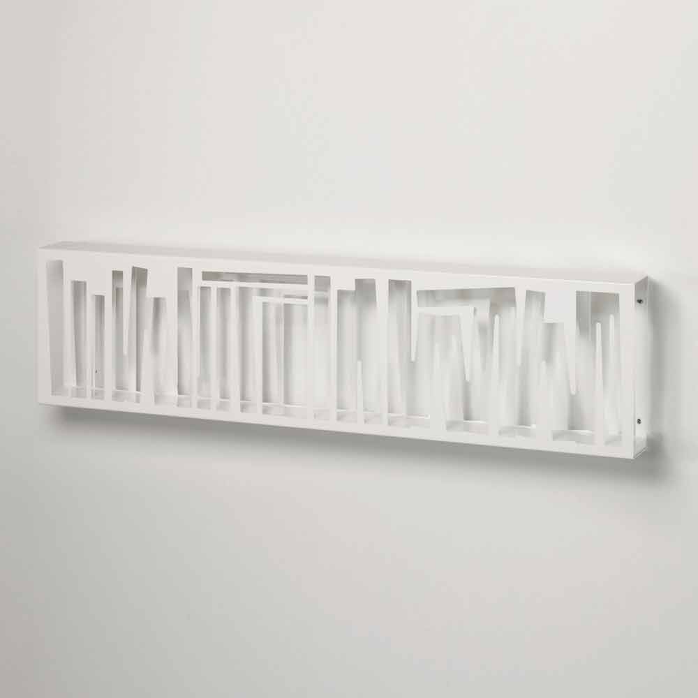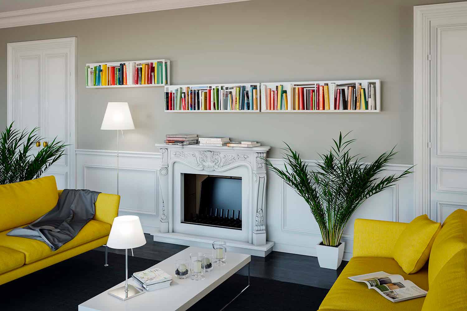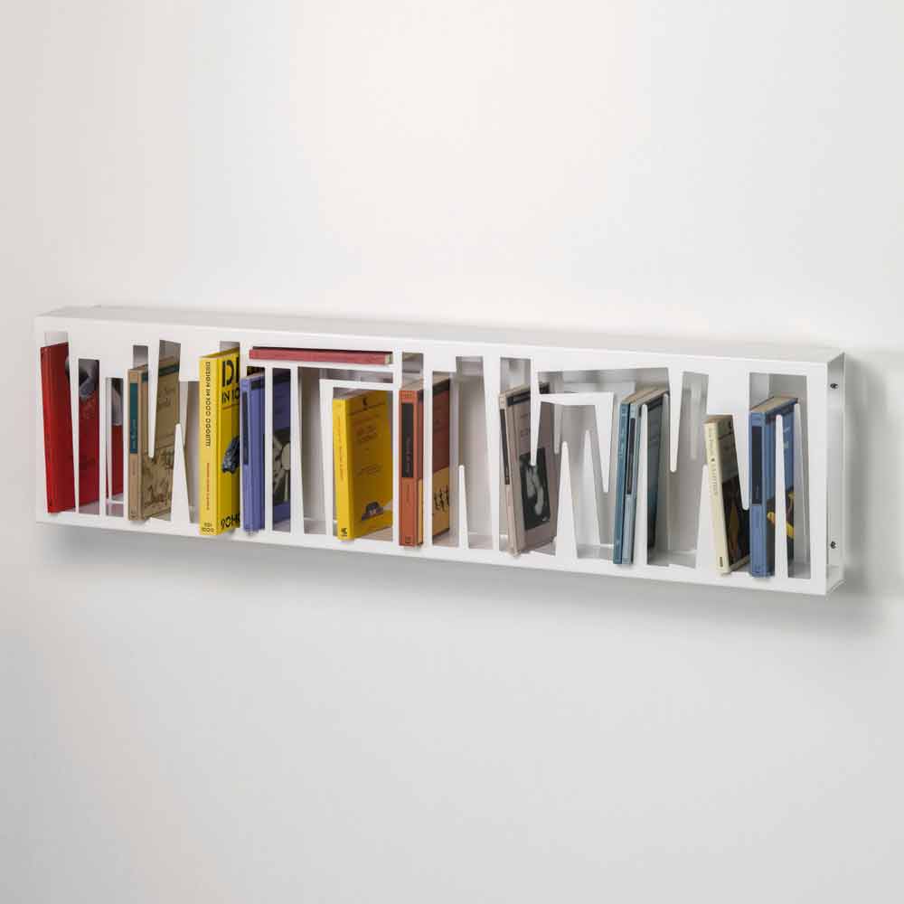 Librería de pared de diseño moderno con estantes producidos en Italia en metal pintado de blanco.