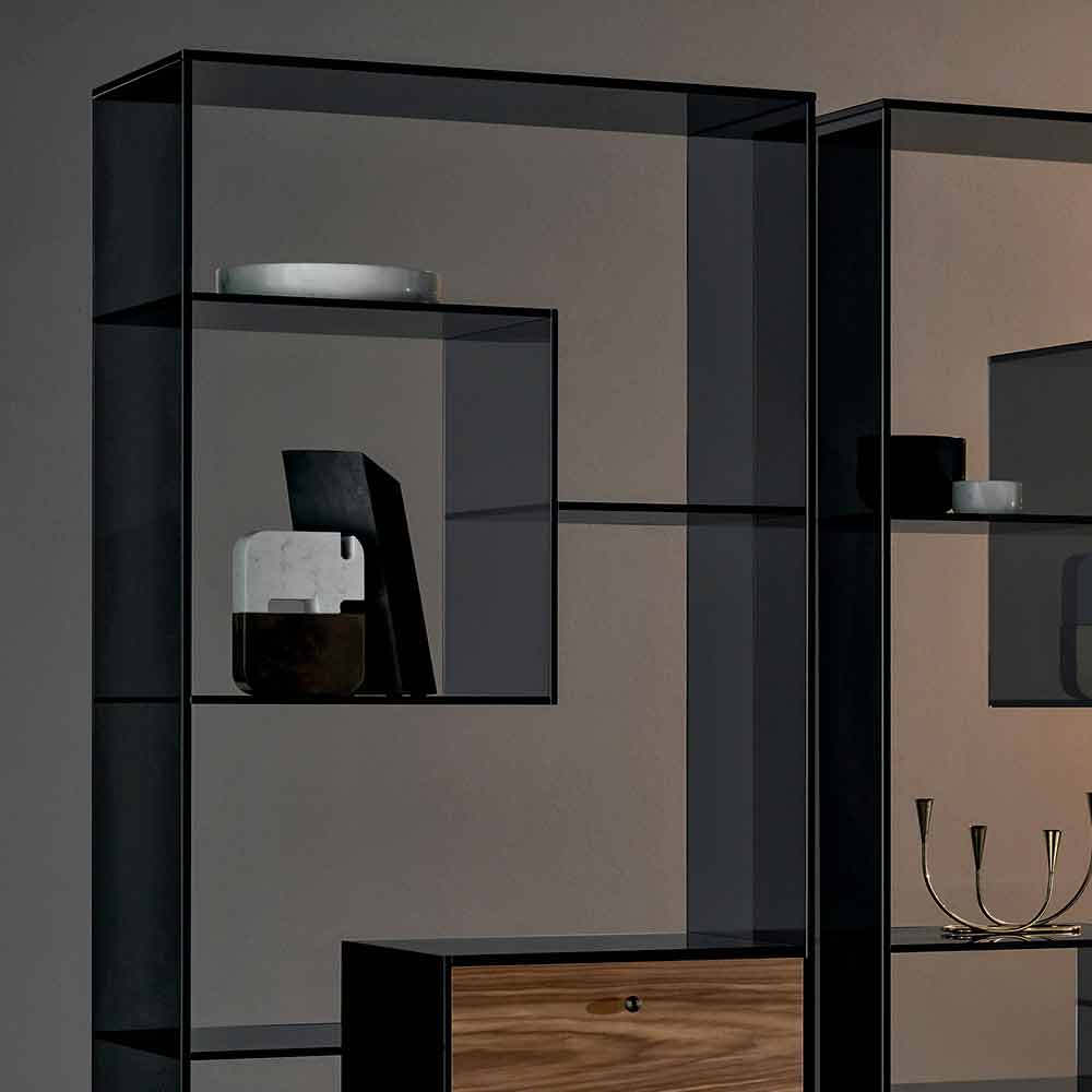 Esta librería expositora se caracteriza por su diseño decidido y elegante, íntegramente realizado en vidrio ahumado.