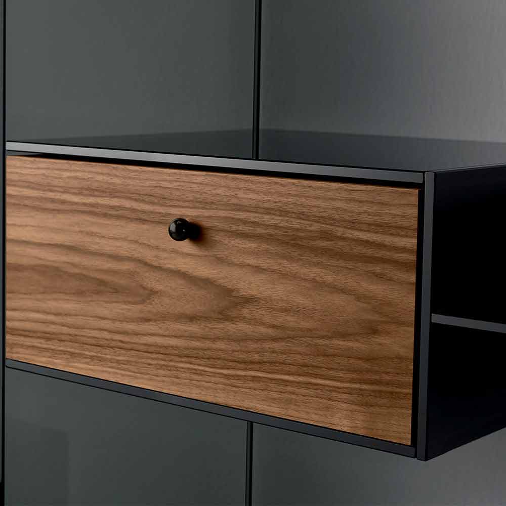 Se incluye un cajón en madera de nogal canaletto con pomo acabado bronce que se puede colocar como se desee en los dos compartimentos de referencia. La carga permitida para cada estante es de 15 kg.