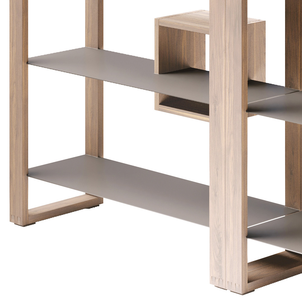 Librería abierta modular e intercambiable en madera de Nogal con estantes en madera lacada Made in Italy.