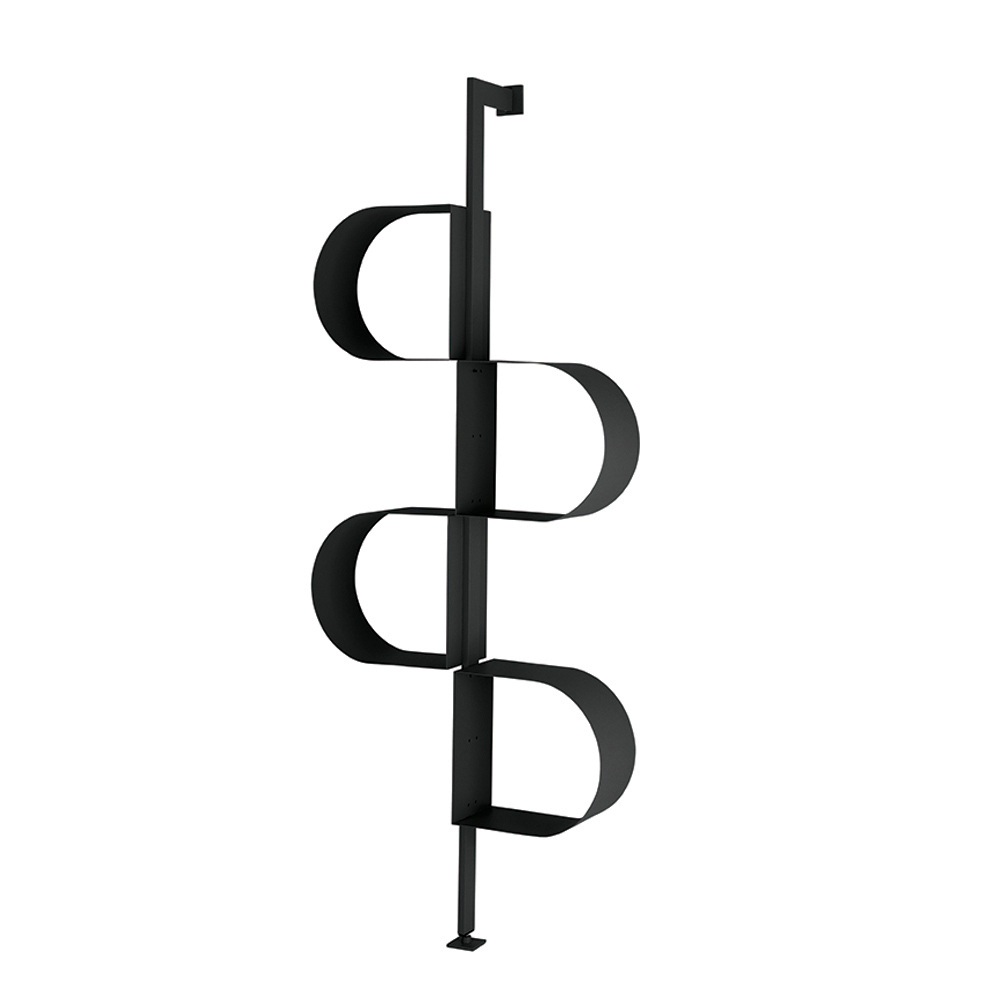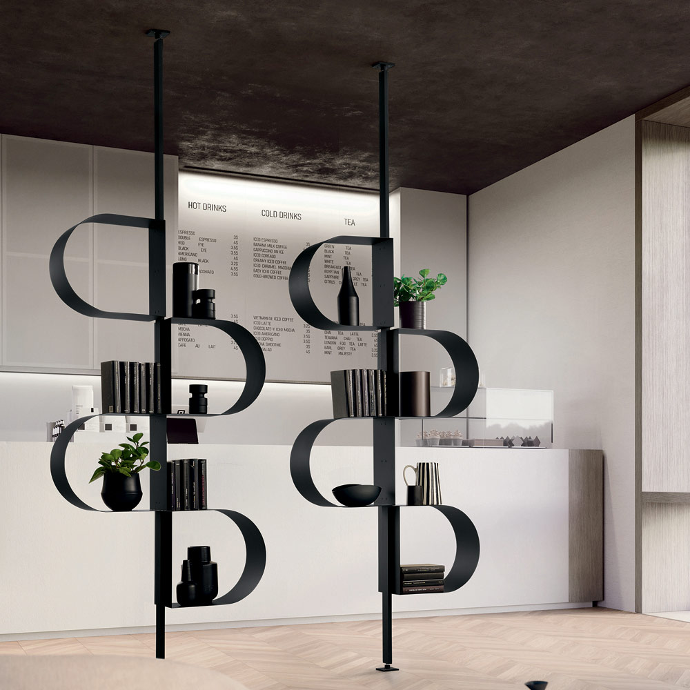 Versátil y funcional, la estantería está disponible para montaje en pared o techo . La versión de techo también puede utilizarse como separador de ambientes, creando divisiones sutiles sin recargar el espacio.