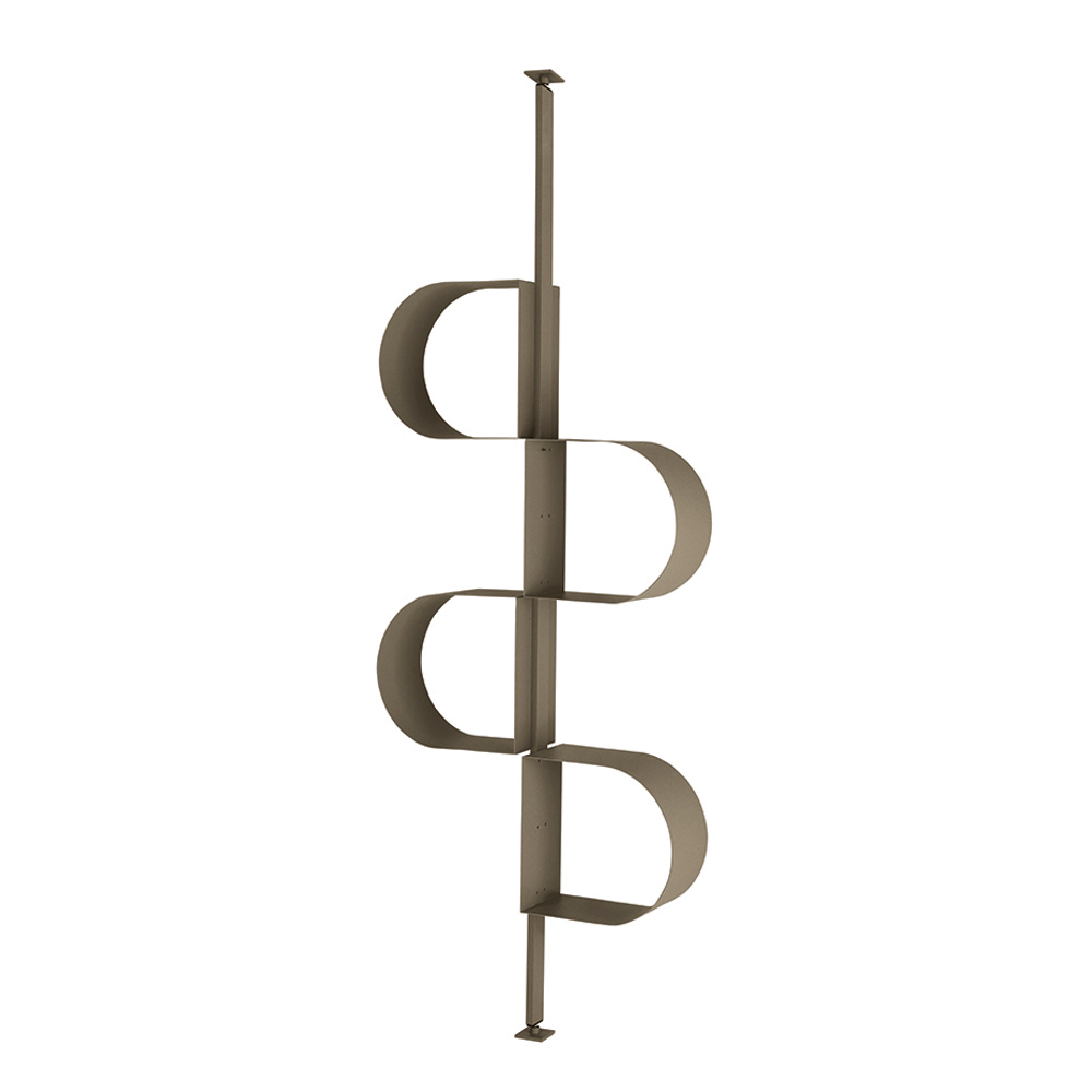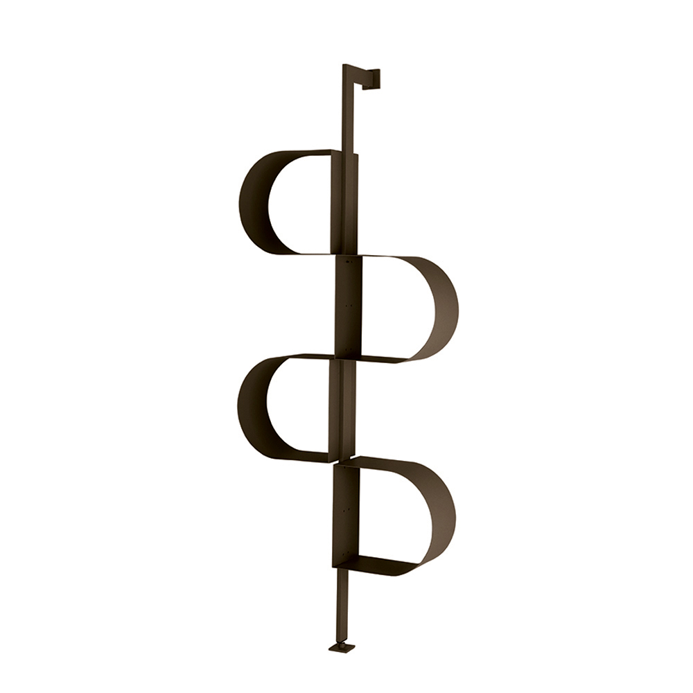 Fabricada en metal pintado , la estantería se desarrolla verticalmente con una estructura que recuerda a una cinta continua , creando una secuencia rítmica de compartimentos . Este diseño particular permite organizar libros y objetos decorativos de forma original y armoniosa.