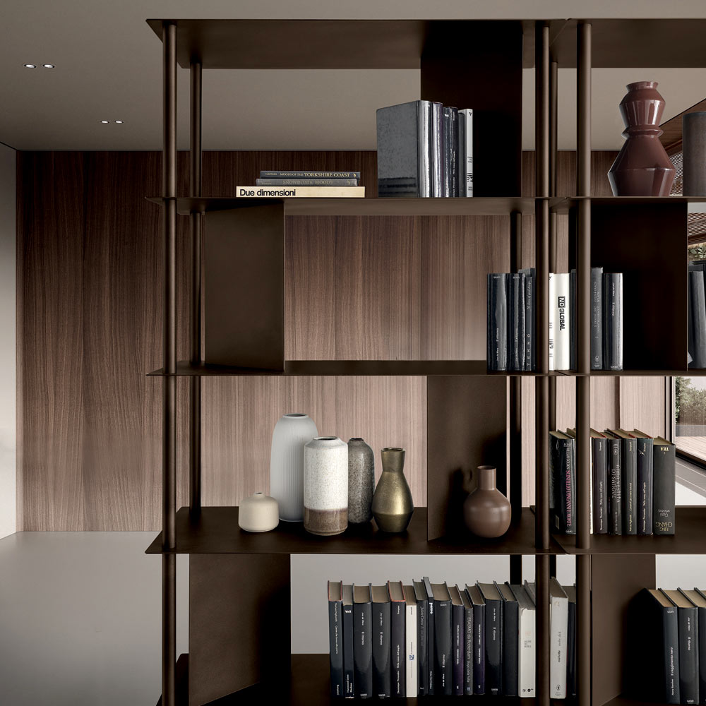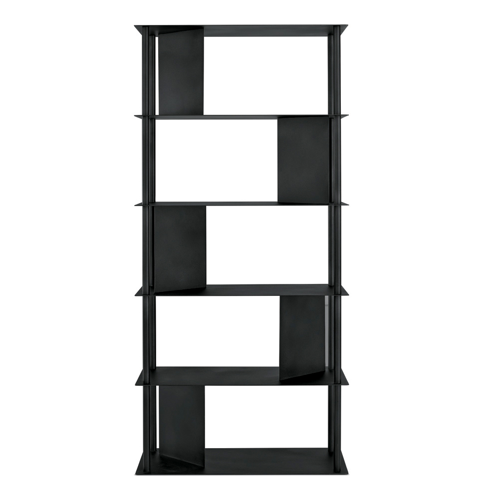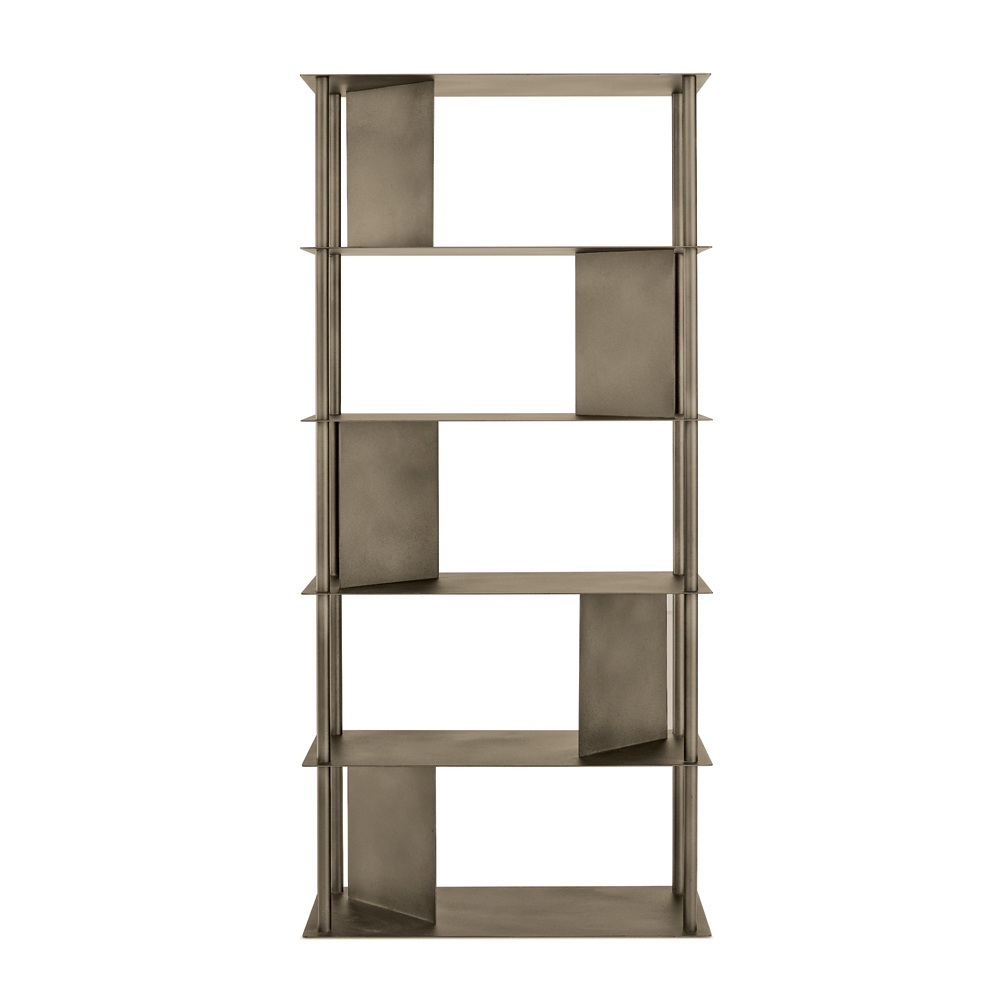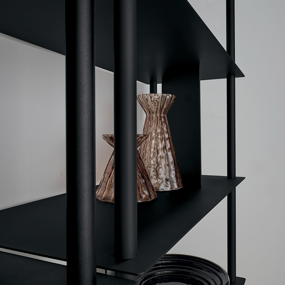 Fabricada en metal pintado , la estantería se compone de cuatro tubos verticales perimetrales que sostienen los estantes, intercalados con placas inclinadas que delimitan el espacio y sirven de soporte para libros y objetos. Esta configuración crea un refinado juego de sólidos y vacíos, aportando dinamismo y profundidad a la composición.