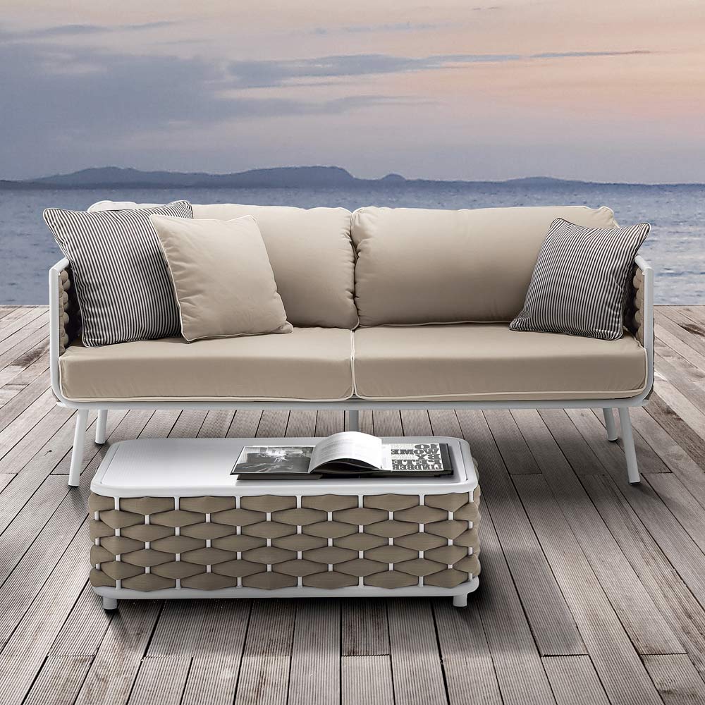 Gracias al uso de materiales especiales de alta calidad, este sofá de exterior garantiza una excelente resistencia a la intemperie, la suciedad, el polvo y las manchas.
