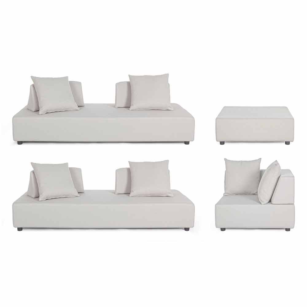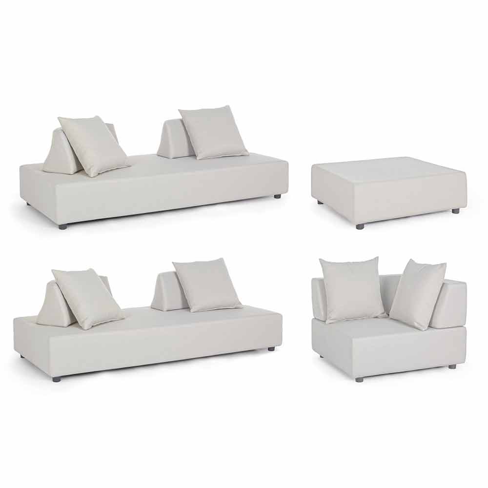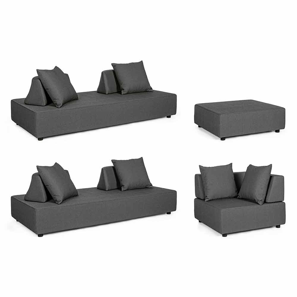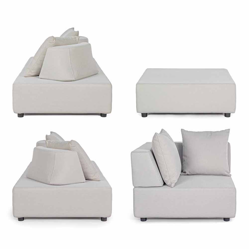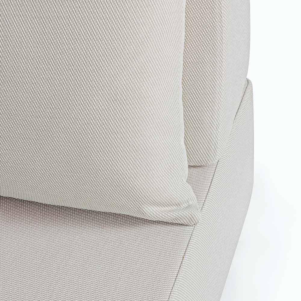 Asientos, respaldos y cojines con funda extraíble en tejido olefínico para uso exterior (100% polipropileno, 285 g / m2), repelente al agua y resistente a los rayos UV (grado 7), impermeabilizado internamente con revestimiento de tejido (poliuretano). Asiento acolchado de espuma de poliuretano (38 kg / m3), respaldo (20 kg / m3).