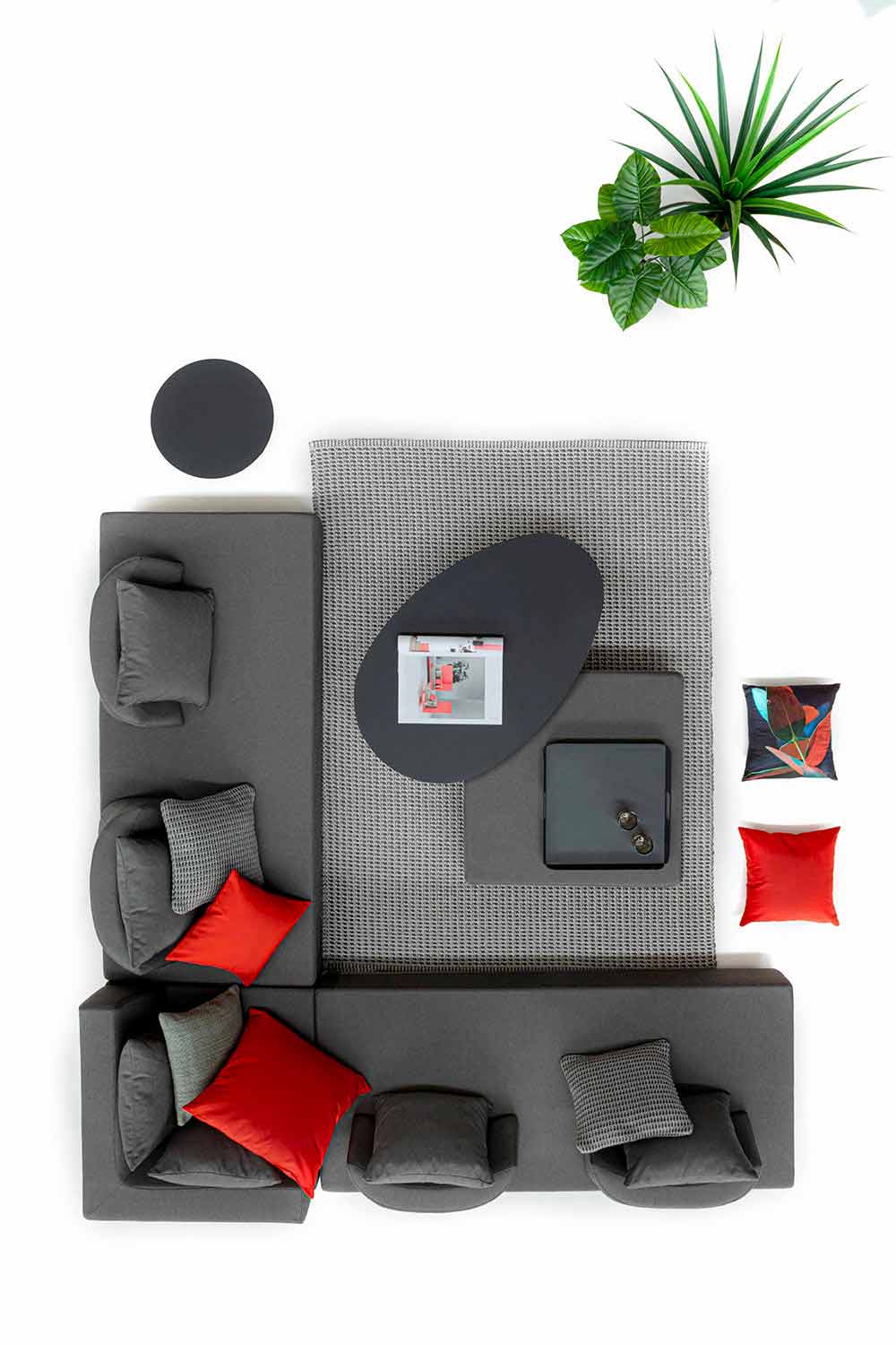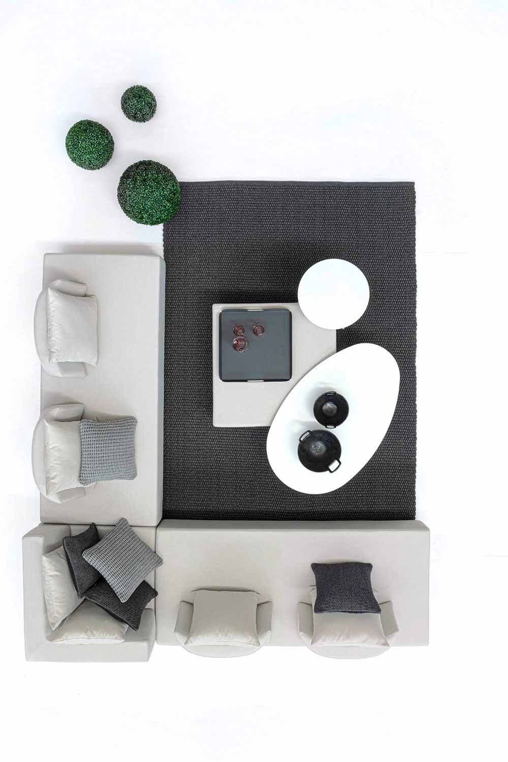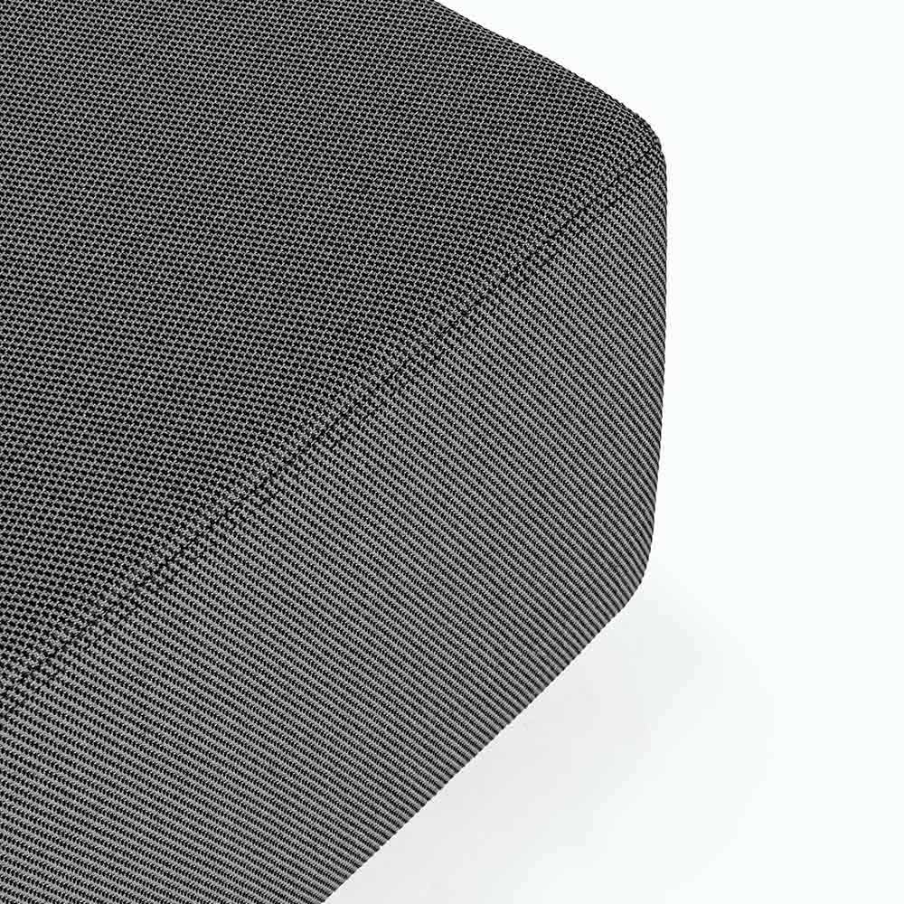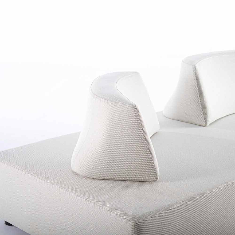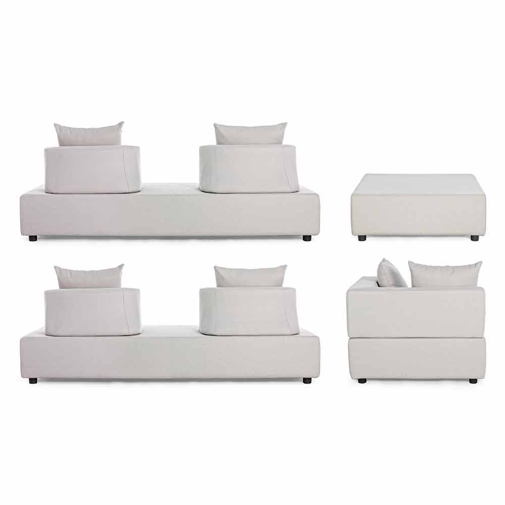 Asientos, respaldos y cojines con funda extraíble en tejido olefínico para uso exterior (100% polipropileno, 285 g / m2), repelente al agua y resistente a los rayos UV (grado 7), impermeabilizado internamente con revestimiento de tejido (poliuretano). Asiento acolchado de espuma de poliuretano (38 kg / m3), respaldo (20 kg / m3).