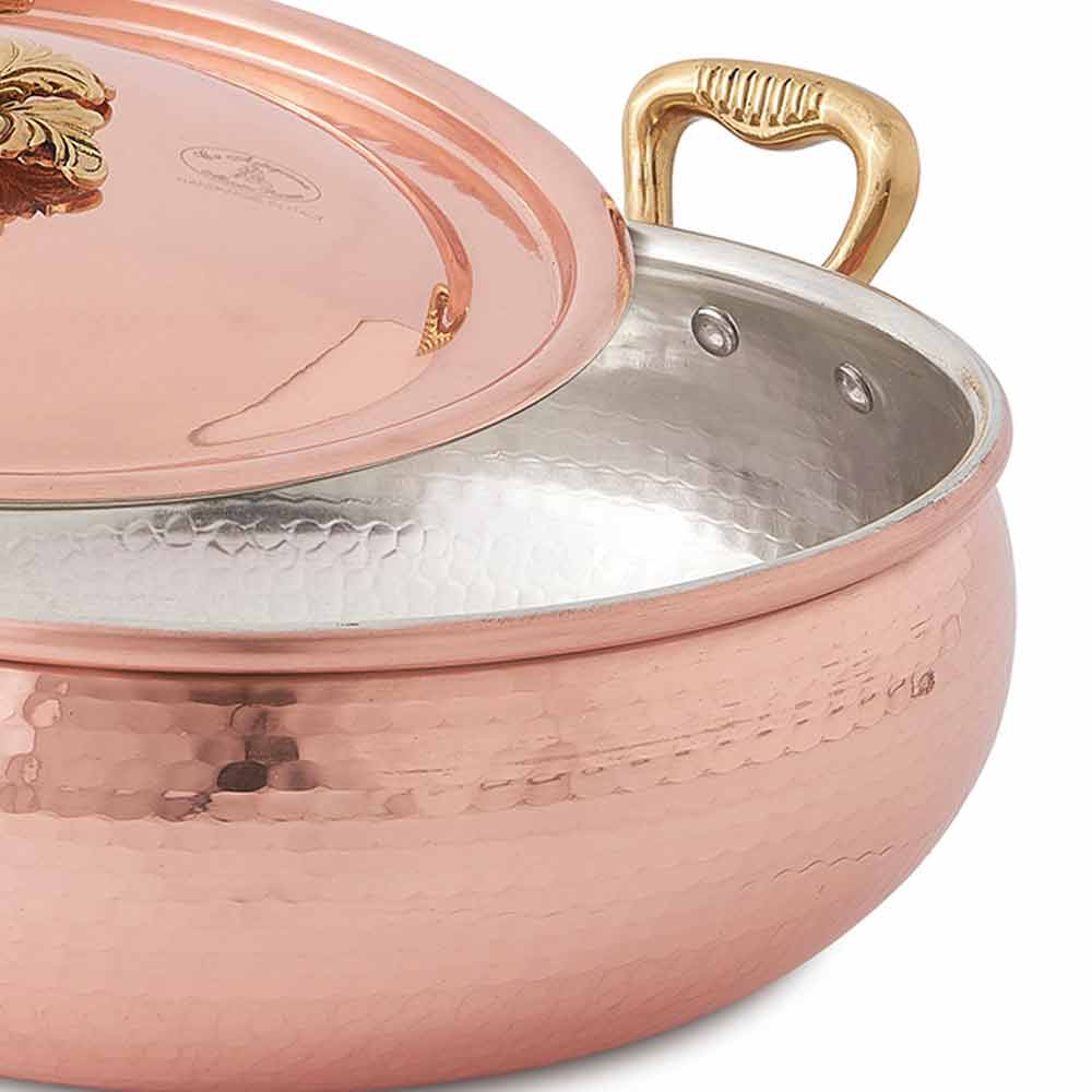 Este práctico y funcional plato de verduras con tapa y asas de latón es una cacerola redondeada de cobre macizo ideal para cocciones lentas como legumbres, salsa de carne y caza, etc.