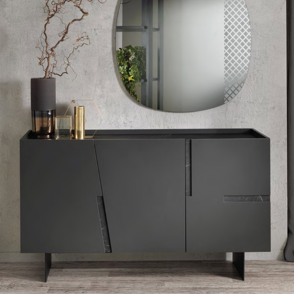 Aparador de salón en melamina con inserciones en laminado o espejo Made in Italy.