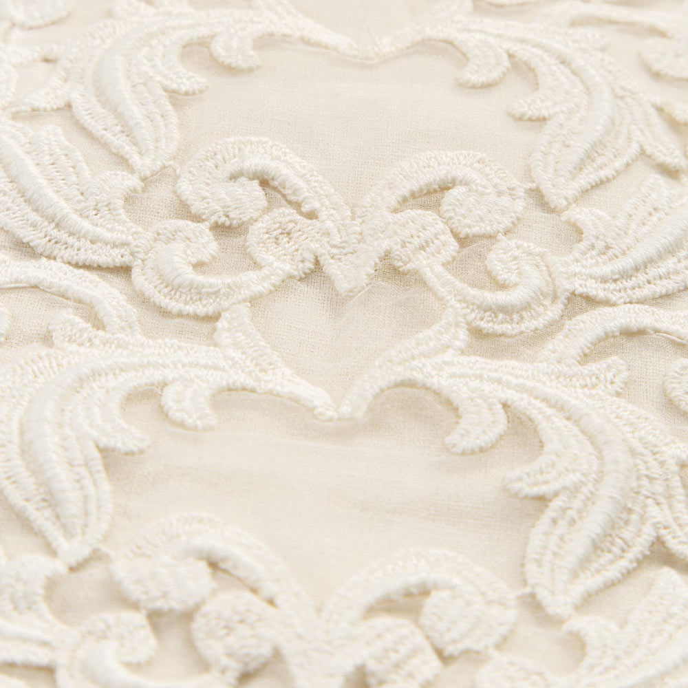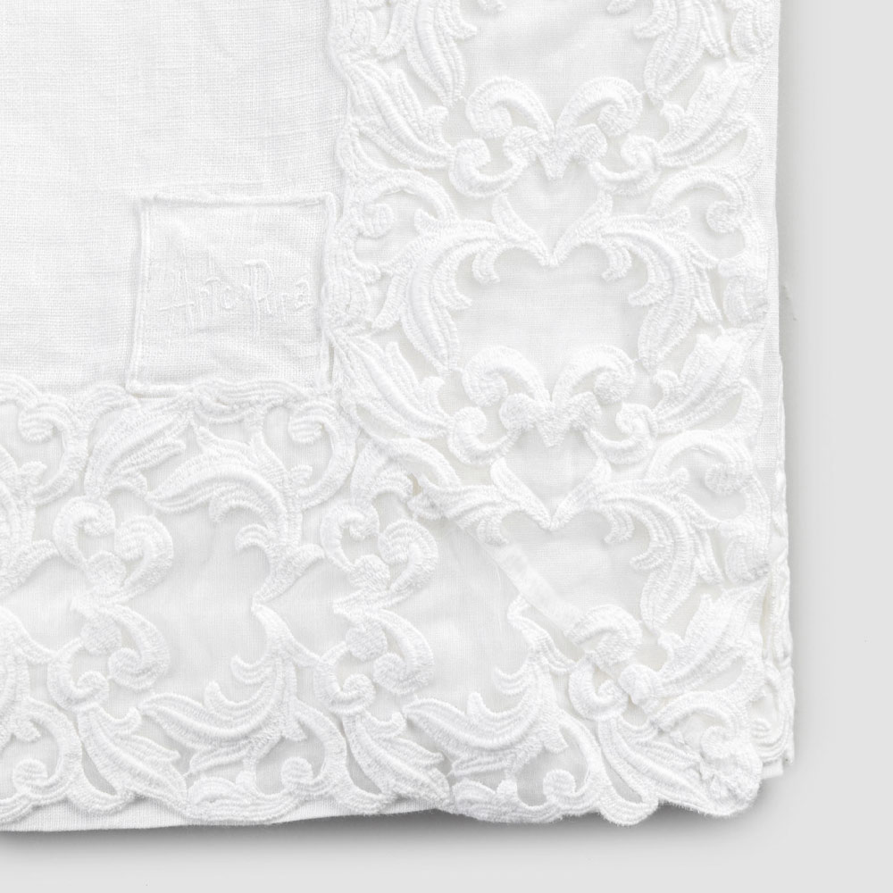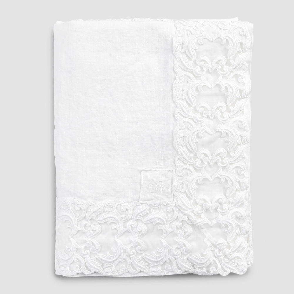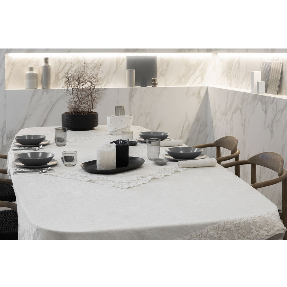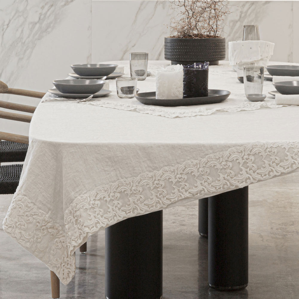 Mantel rectangular de lino grueso con marco y encaje de Farnesio, hecho artesanalmente en Italia.
