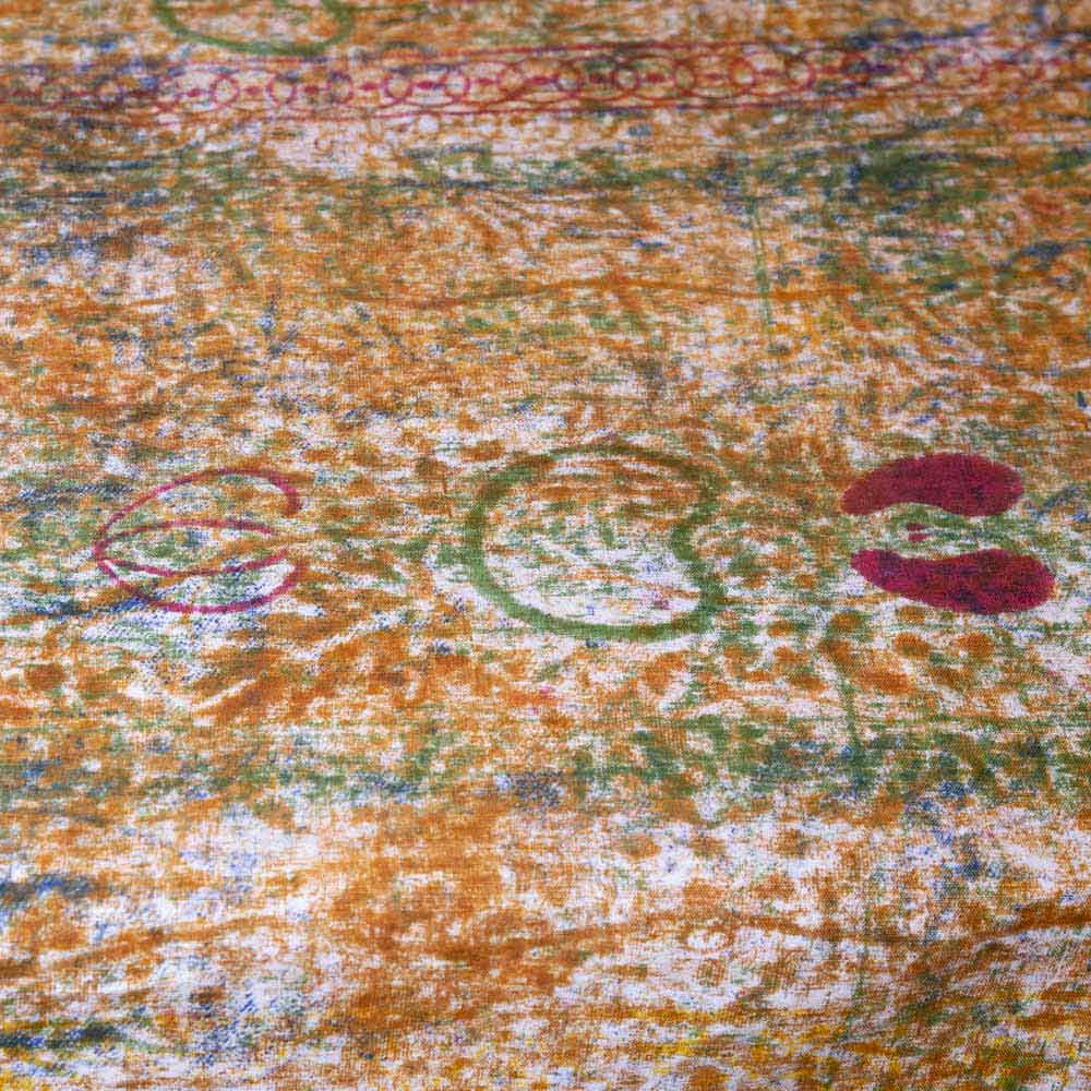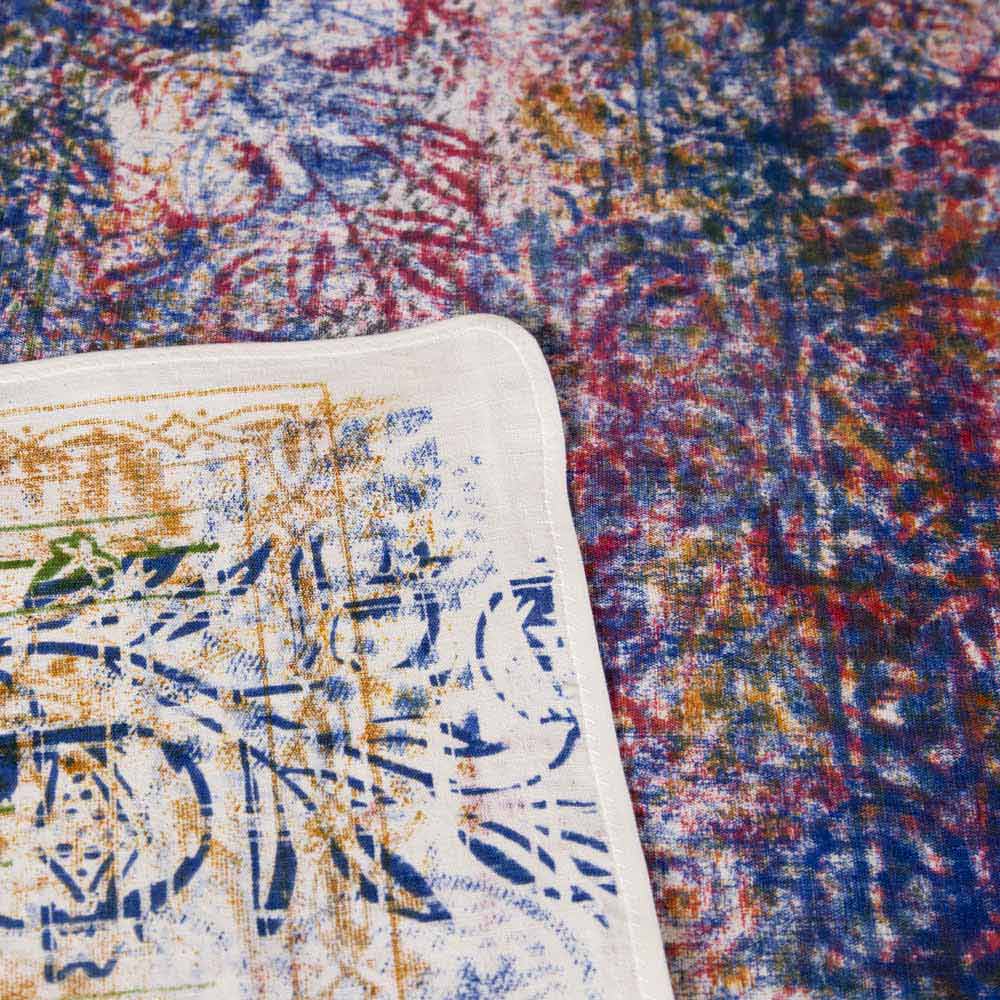 - Impresión a mano : esta fase dura meses. La tela se coloca en el banco de trabajo debajo de los diversos artículos que en meses y meses de trabajo se alternarán e imprimirán. Los diversos colores y diseños se transferirán "espontáneamente" a este tejido debido a la presión del molde de madera, y se superpondrán. El resultado final será una explosión de colores y tonos impredecibles e irrepetibles.