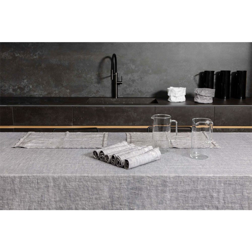 El valor de la tradición se une al estilo de vida moderno con este mantel de lino gris antracita adornado con un borde geomérico.