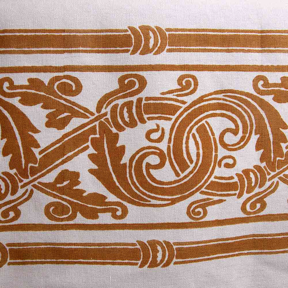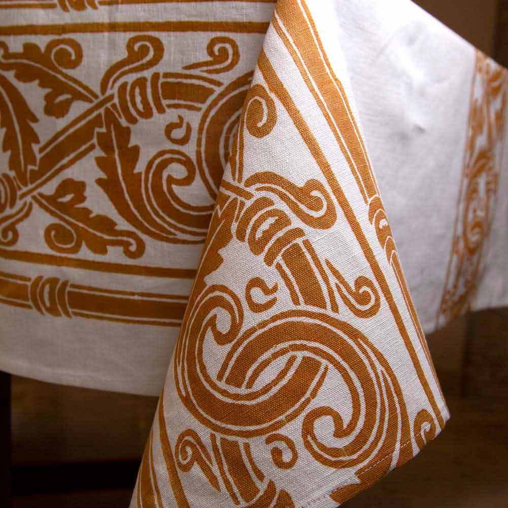Mantel de lino y algodón italiano de alta calidad elaborado con una fina y artística impresión a mano en color óxido a lo largo de los bordes y el centro, trabajo manual en exclusivas telas antiguas hechas en Italia.
