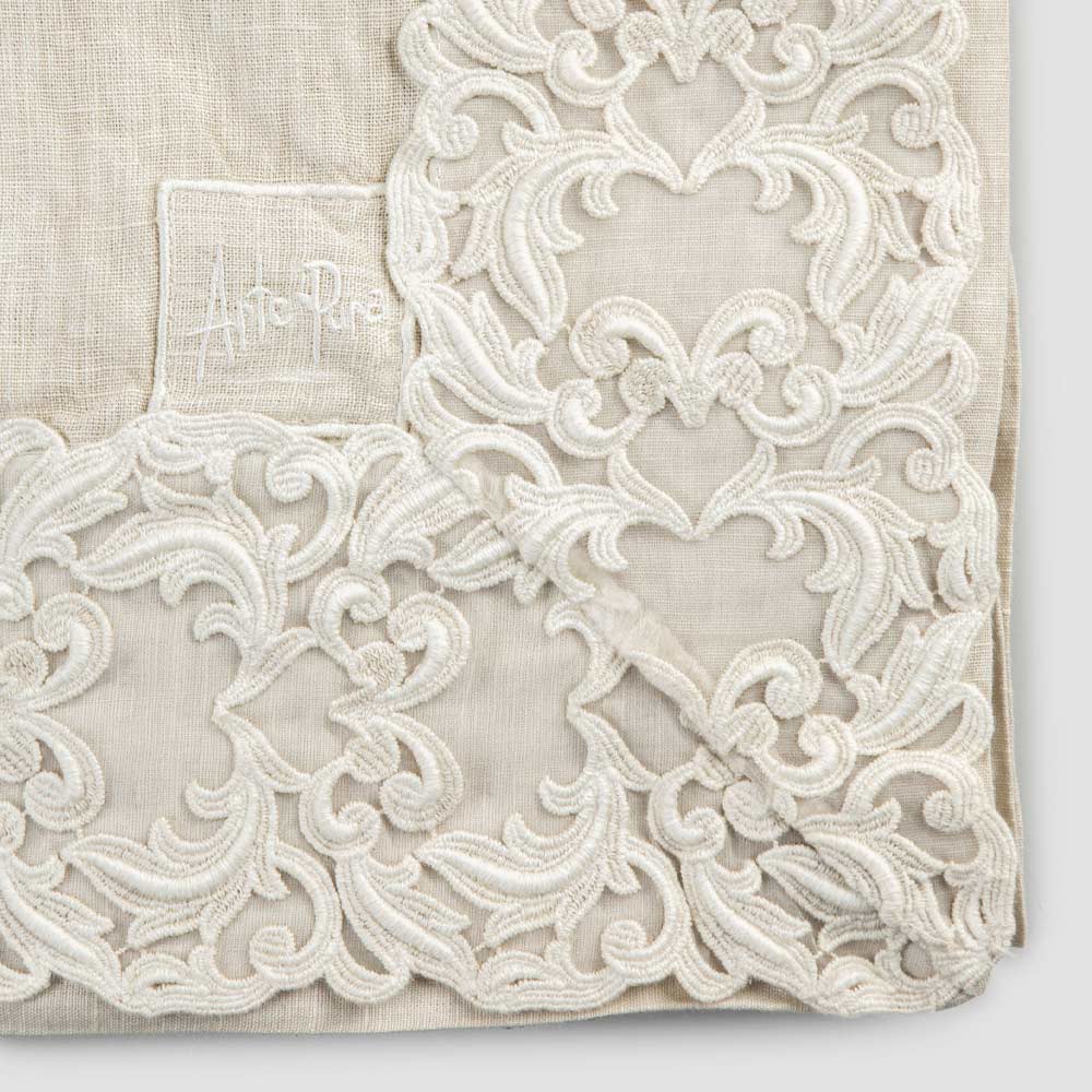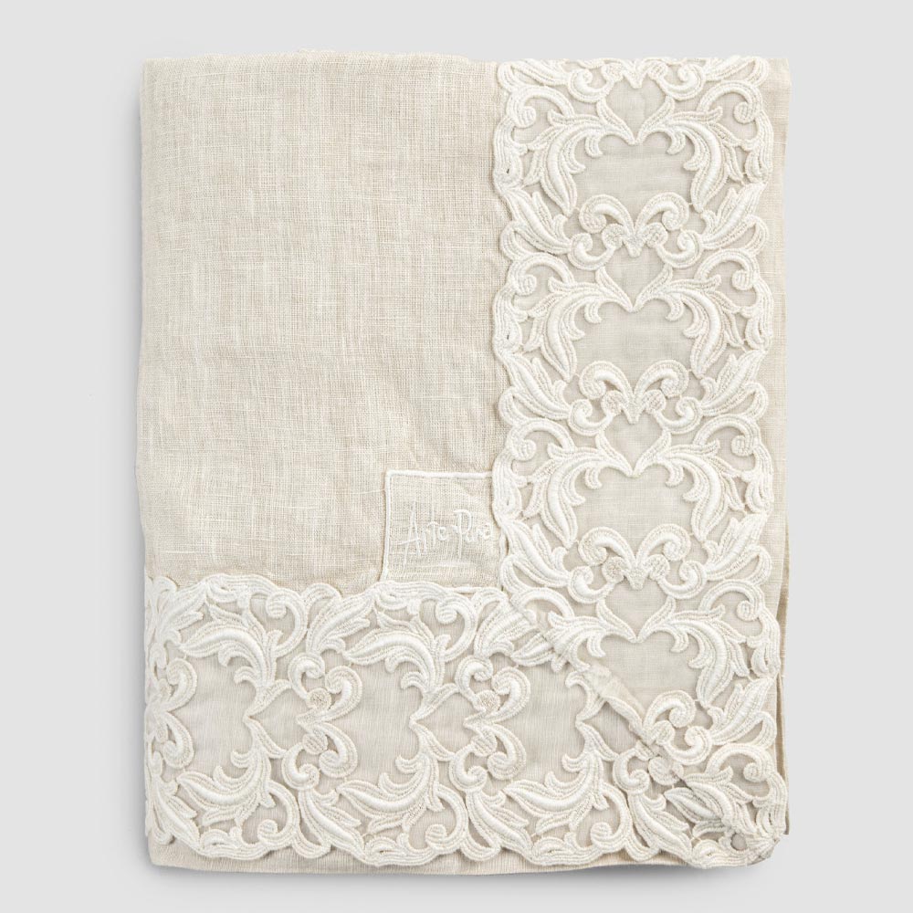 Mantel de lino con encaje Farnesio rectangular, fino artículo hecho en Italia.