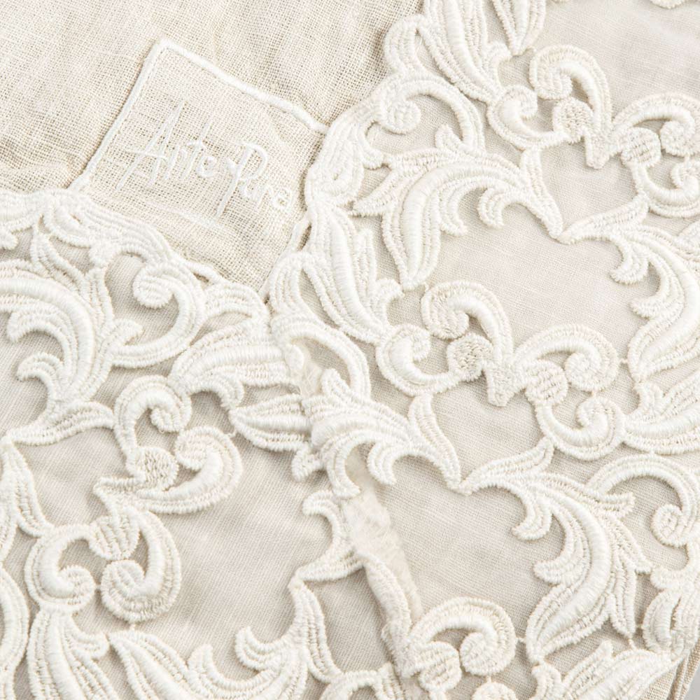 mantel rectangular de lino beige rosado adornado con encaje Farnese. Fabricado en Italia con materiales de alta calidad y suavizado al tacto gracias a tratamientos especiales que realzan el aspecto natural. Ideal para la mesa ya que es hipoalergénico y antibacteriano, además del uso de