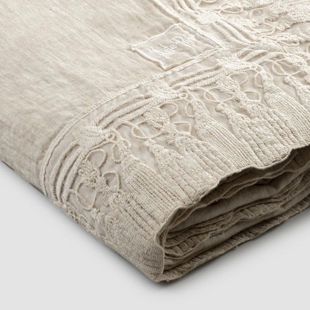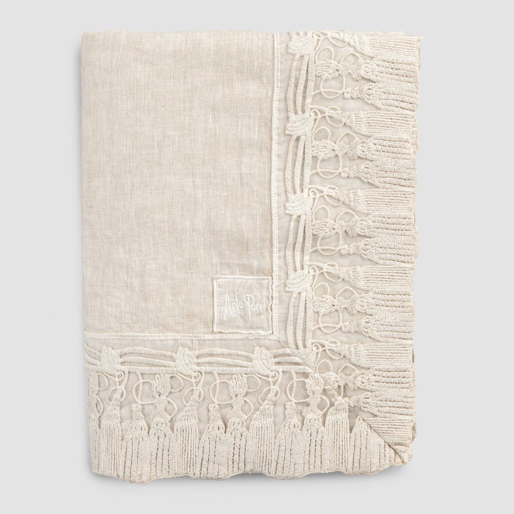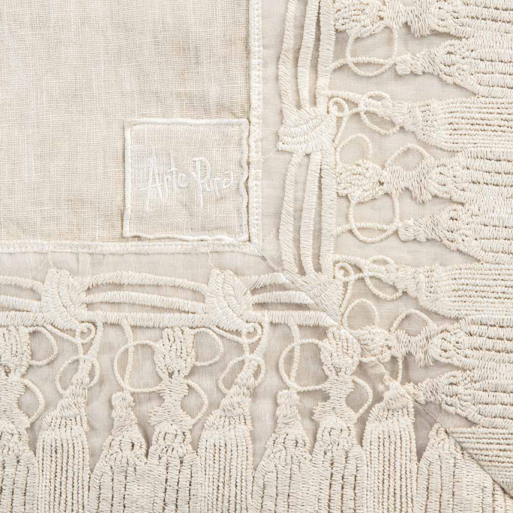 Mantel rectangular de lino con borlas de encaje, lujo hecho a mano en Italia.