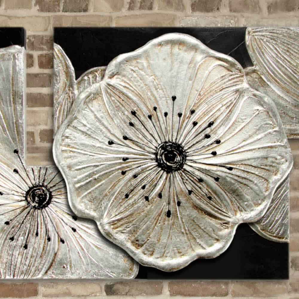 Composición floral sobre tela, decorada a mano, detalles de resina sobre matérico, estructura con elemento central en relieve, retoque lúcido.