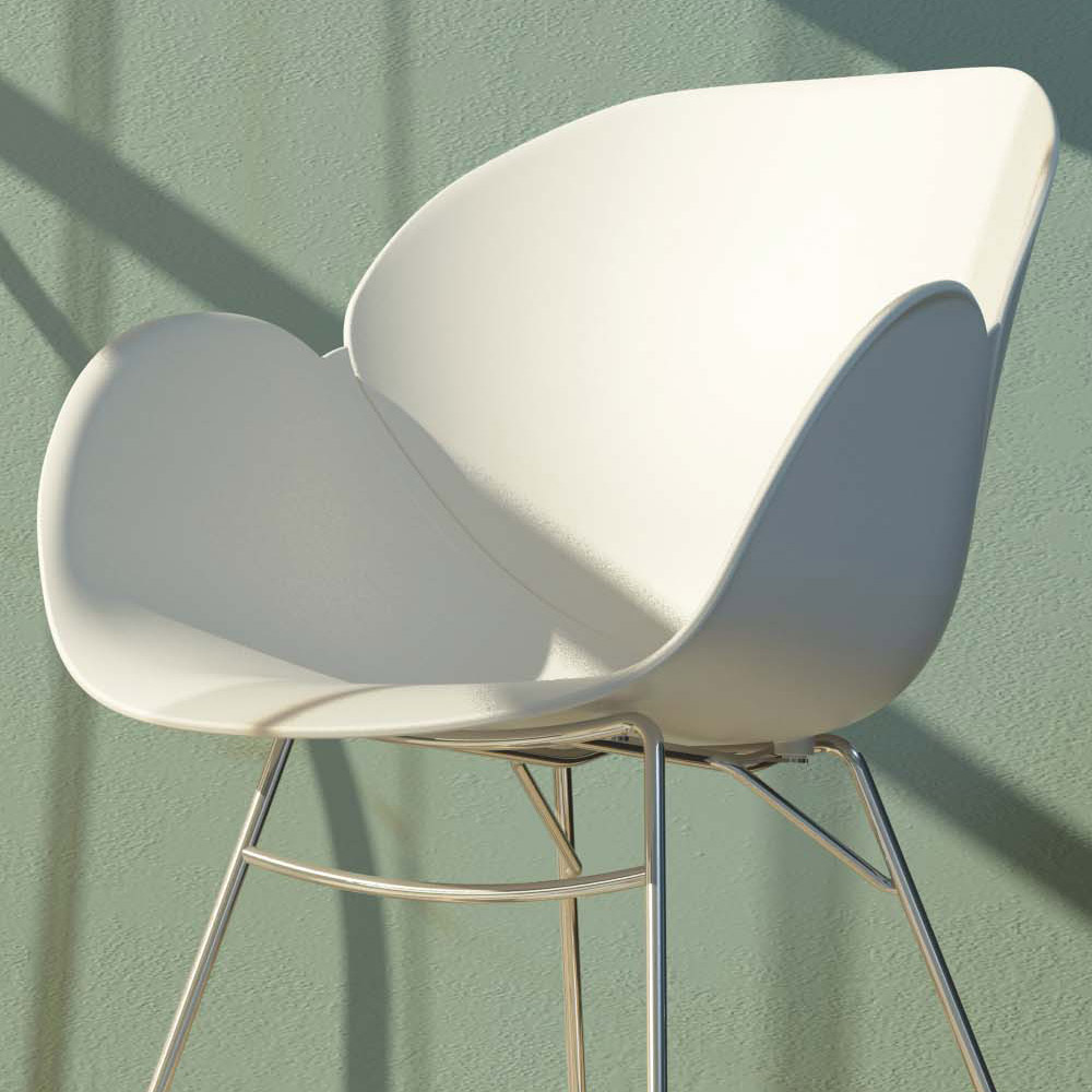 Mecedora para salón compuesta por estructura de metal cromado y carcasa de polipropileno blanco . Un mueble original con una estética exclusiva , ideal para completar tu salón con personalidad y un toque innovador . La particular forma redondeada de la carcasa es envolvente y confortable , ofreciendo así un asiento acogedor y el máximo confort junto con un diseño refinado y creativo .