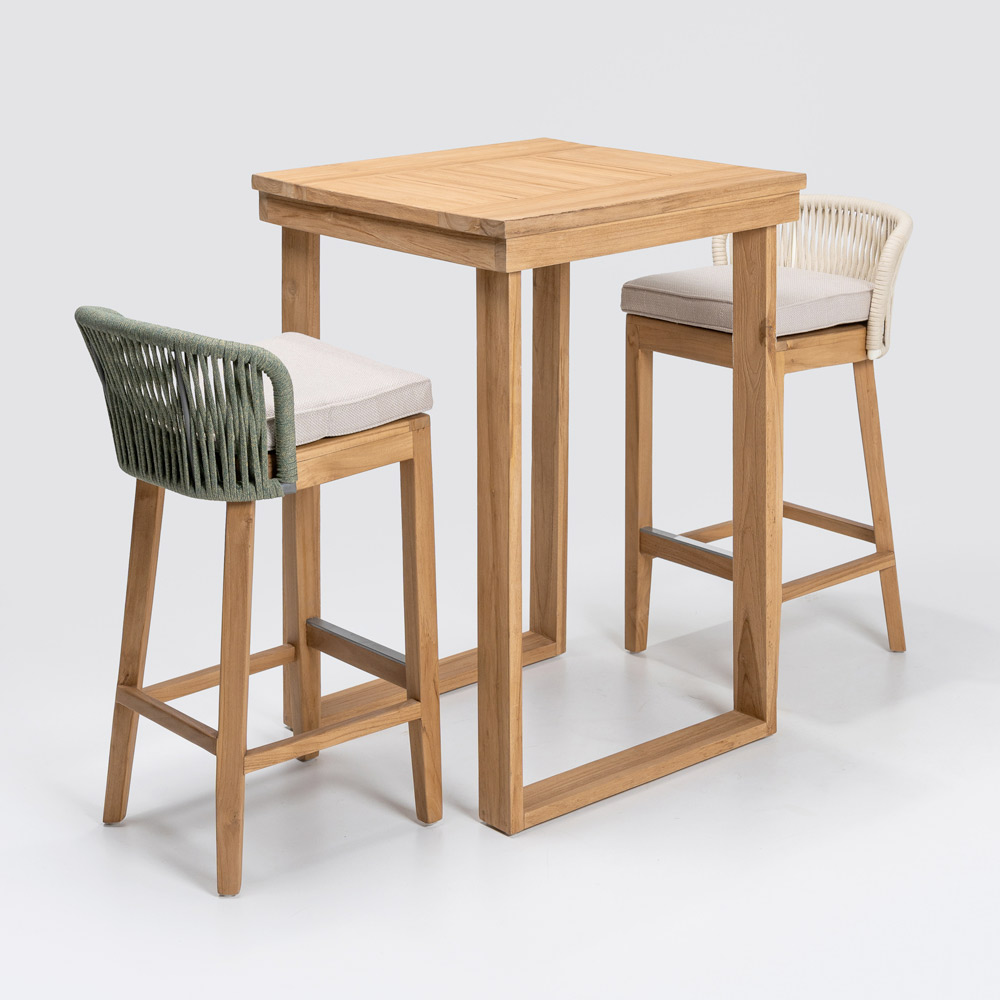 Esta elegante mesa alta de bar combina a la perfección un diseño sofisticado con materiales naturales . Fabricada con una sólida estructura de teca natural cepillada , cada detalle está diseñado para garantizar durabilidad y resistencia , mientras que el tablero de teca natural cepillada ofrece una superficie lisa y refinada que realza la belleza de la madera con su veta única .
