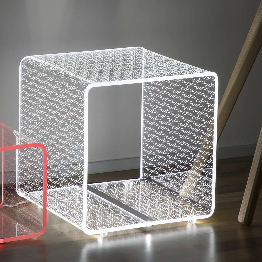 Mesa de centro luminosa con LED RGB en acrílico transparente 2 variantes y 2 tamaños made in Italy.