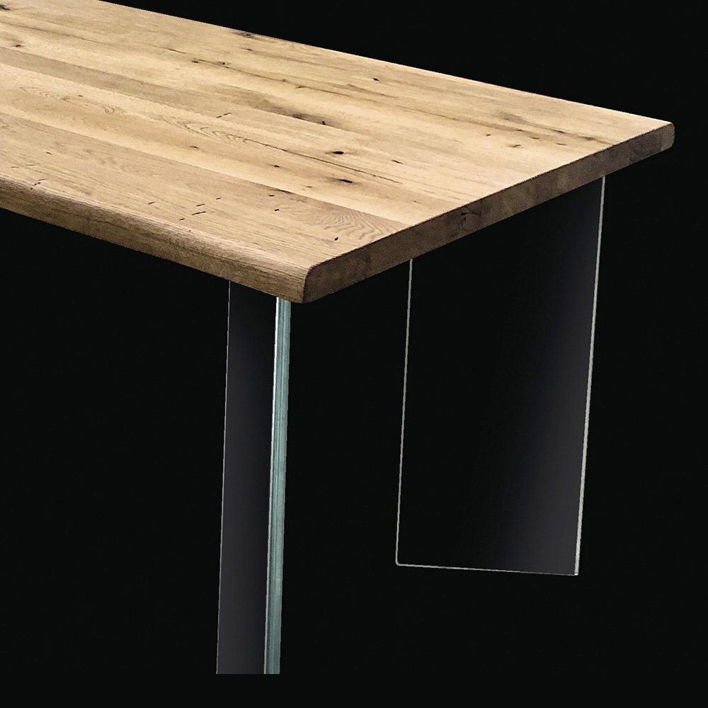 El sobre de esta mesa está enchapado en roble macizo marrón anudado y su base es en cristal extra blanco .