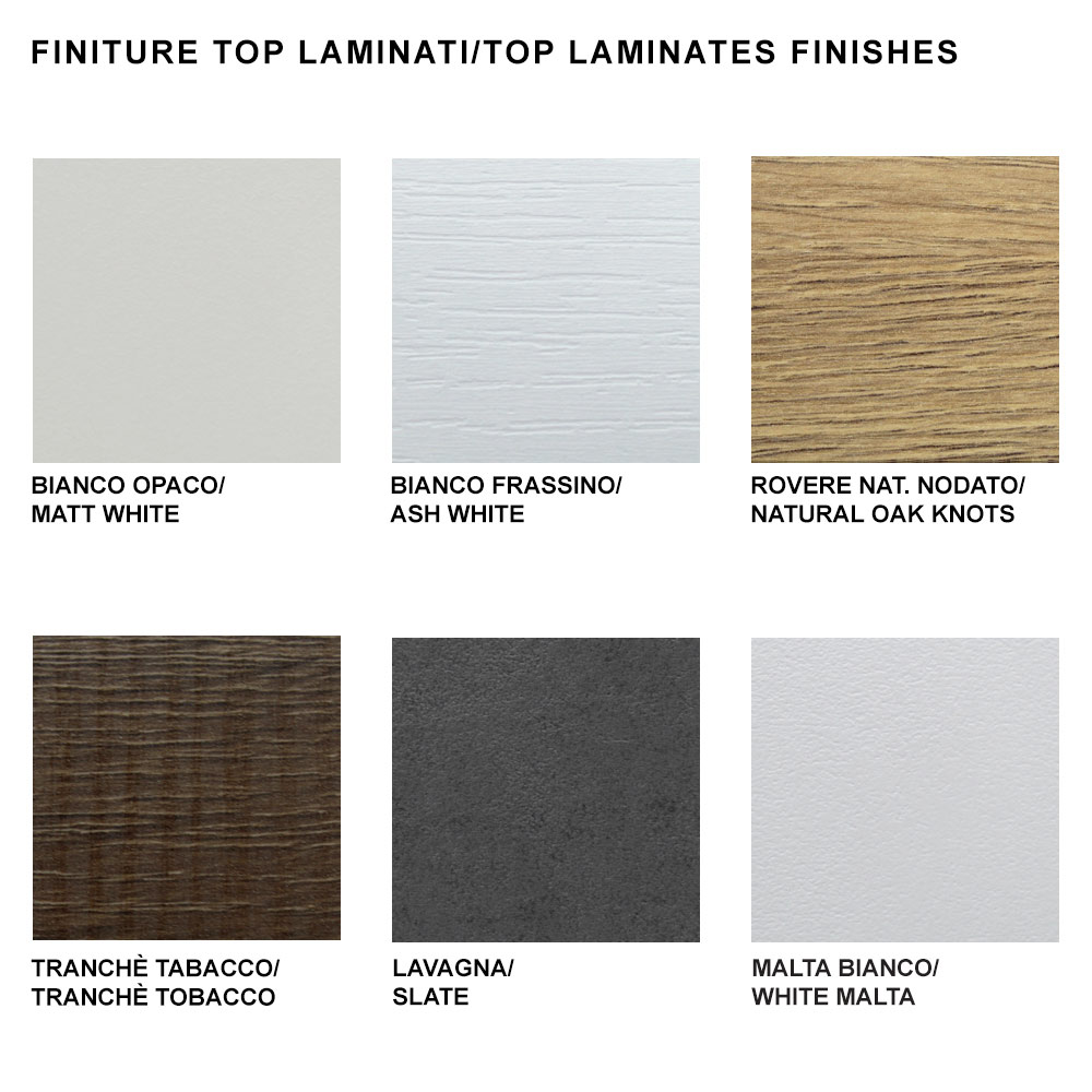 acero lacado en blanco, visón o negro. Disponible en diferentes medidas y acabados para la tapa: