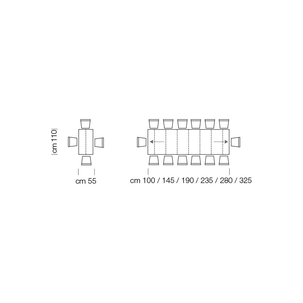 - L 55 (325) x P 110 x H 73,5 cm 14 plazas extensible con seis extensiones externas de 45 cm cada una.