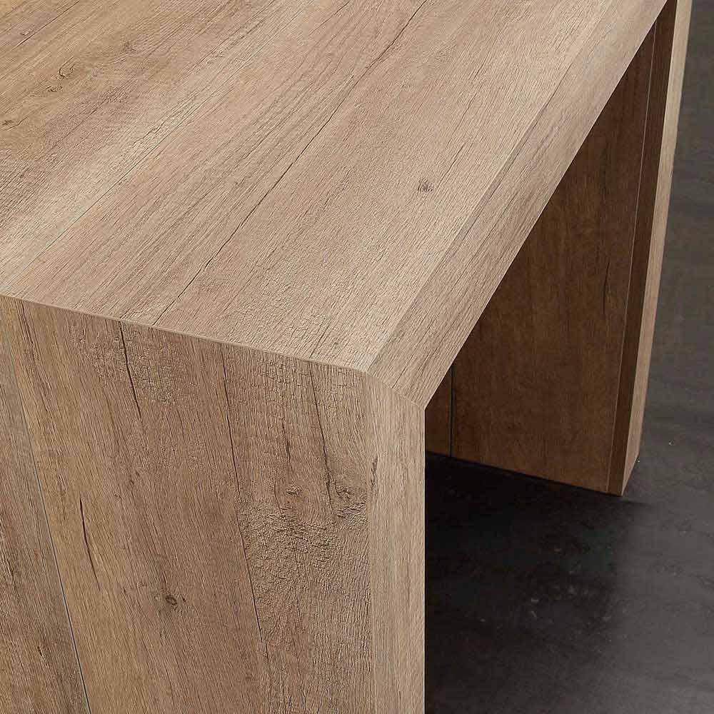 Uri está fabricado en panel de melamina, disponible en los acabados roble nudoso, roble tiza y blanco poro abierto. Las extensiones deben almacenarse fuera de la mesa de la consola.