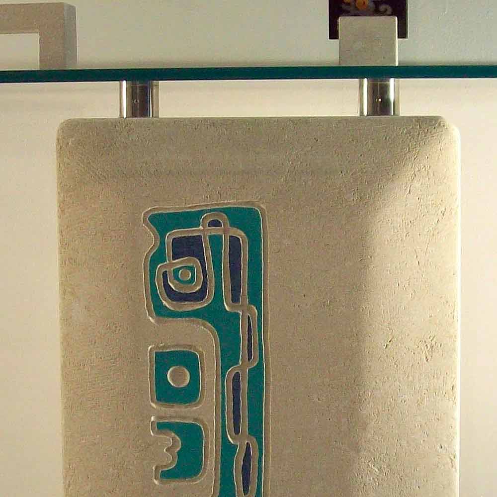 Mesa consola rectangular, realizada enteramente en Italia, con una base de piedra natural de Vicenza, esculpida manualmente directamende del bloque de piedra.
