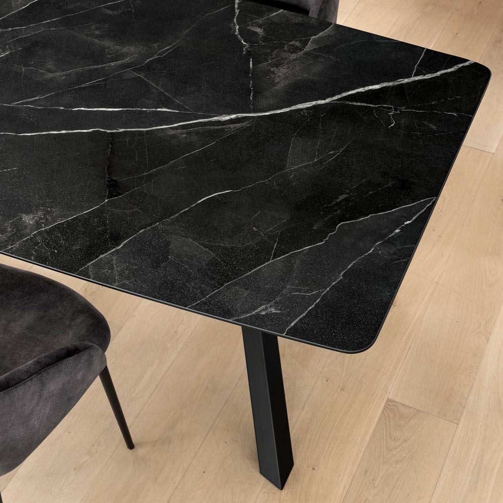 Elegancia absoluta y materiales excelentes: esta mesa fija en Laminam y metal está diseñada para quienes desean llevar a su casa o a un espacio contract un mueble de fuerte impacto visual , sin renunciar a la resistencia y la funcionalidad .