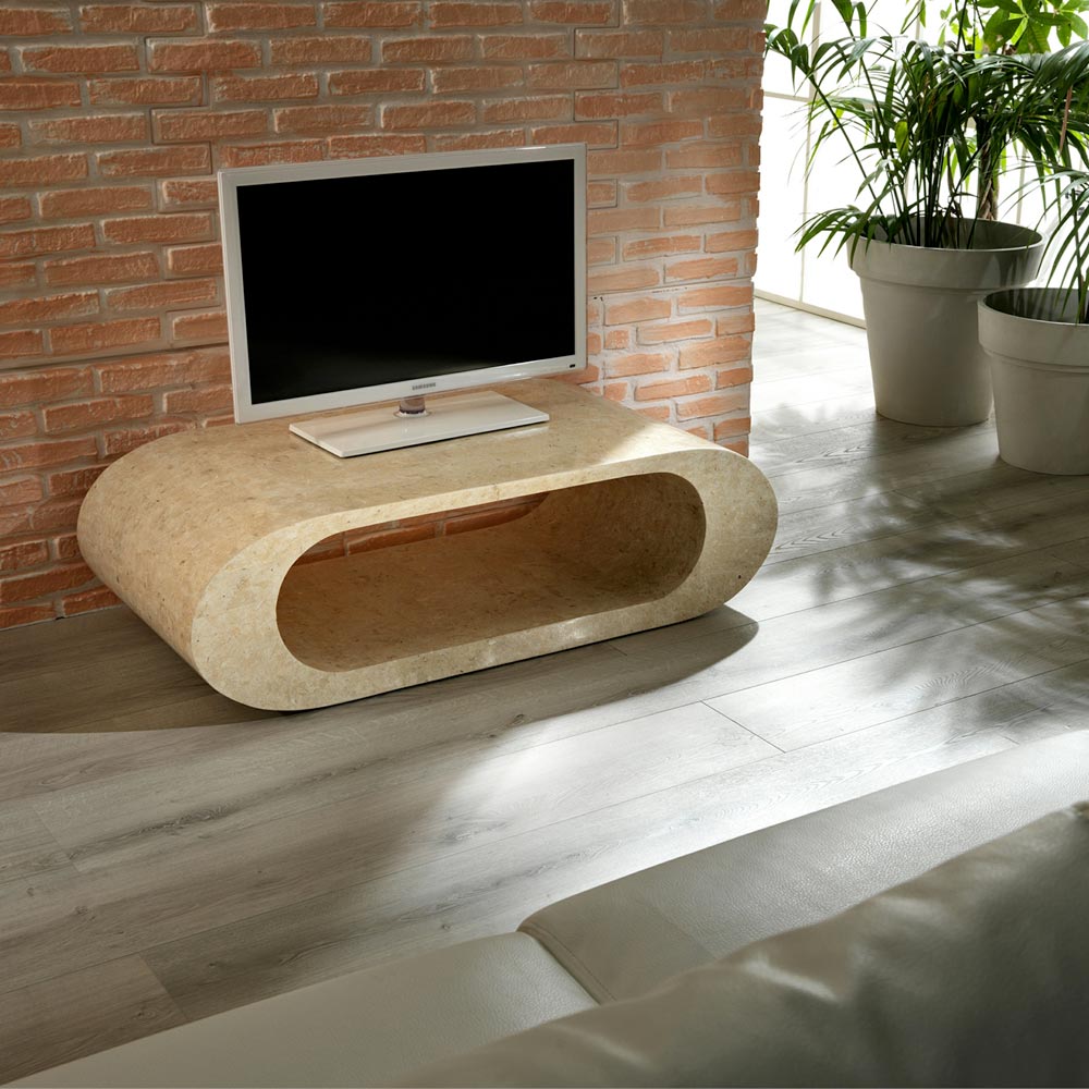 Mesa de centro/mueble TV en piedra fósil de ágata blanca.