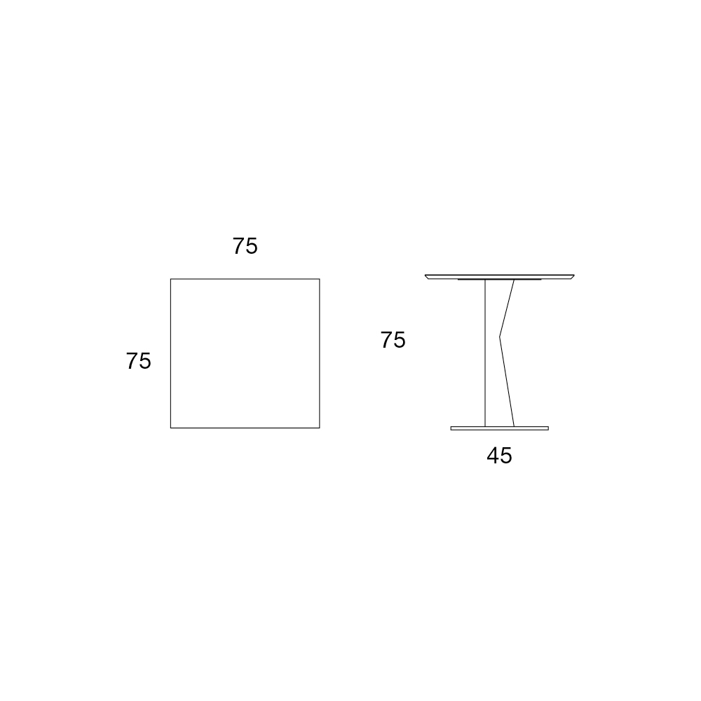 Mesa cuadrada de cerámica mate y base de metal inclinada, fabricada en Italia.