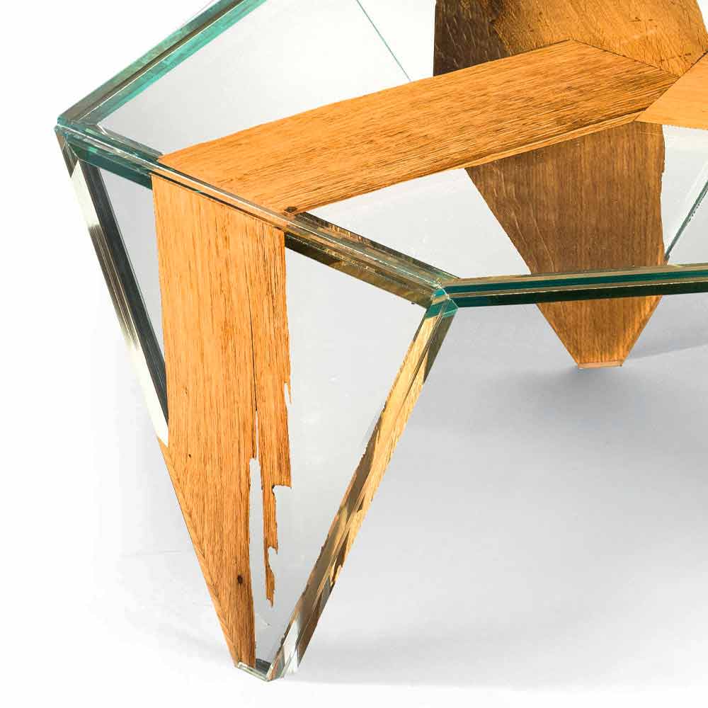 Mesa de centro con tapa hexagonal Fabricado íntegramente en Italia en vidrio acoplado (10 + 10 mm) en cuyo interior se inserta una fina sección de briccola de madera de roble. De la unión entre el encanto de la madera y sus vetas que recuerdan la naturaleza y la elegancia atemporal del vidrio , que recuerda la transparencia del agua, nace un complemento de decoración exclusivo , caracterizado por una fuerte personalidad refinada . Su fuerza está representada por la forma original y por la maravillosa combinación de acabados y materiales que aumentan su valor sin descuidar nunca el aspecto funcional fundamental subrayado por la mano de obra 100% Made in Italy y el uso de materias primas de calidad. para ofrecer la mesa de centro perfecta ideal para completar con estilo cualquier salón con un gusto contemporáneo.