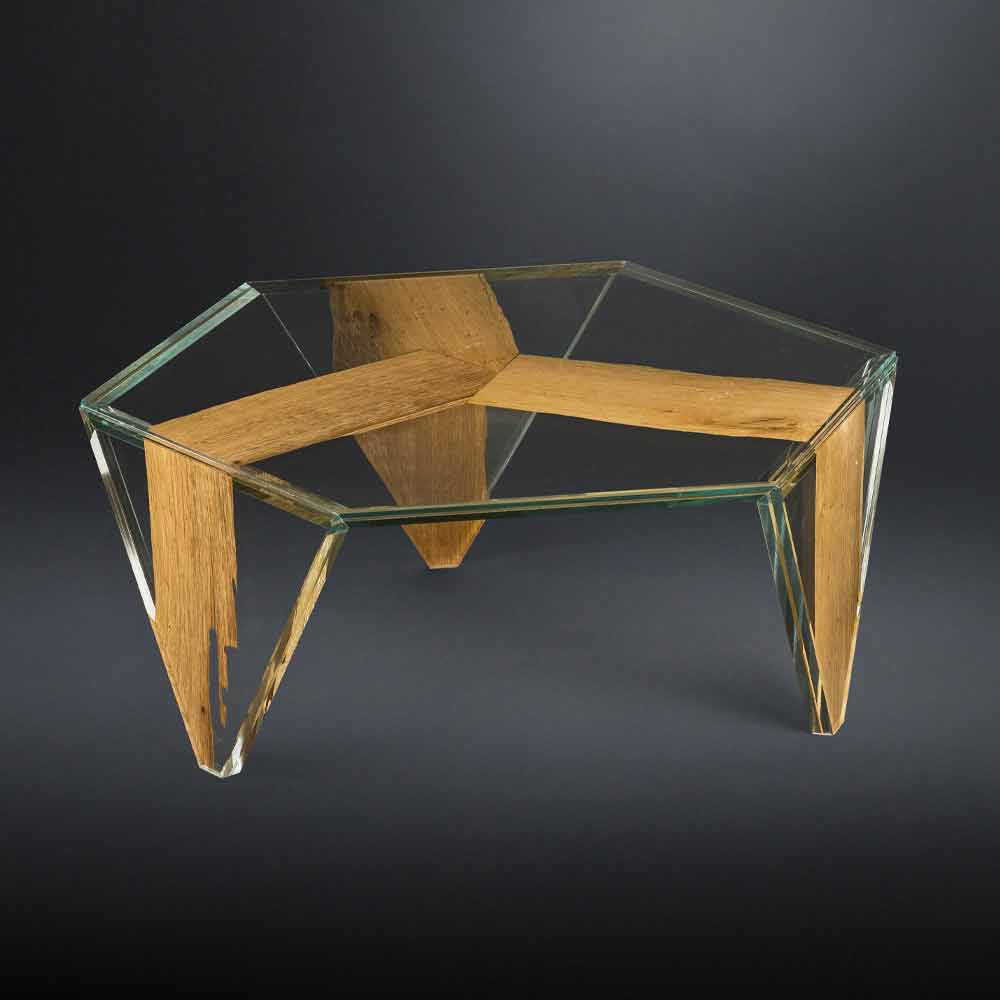 Mesita hexagonal fabricada en Italia en vidrio y madera preciosa.