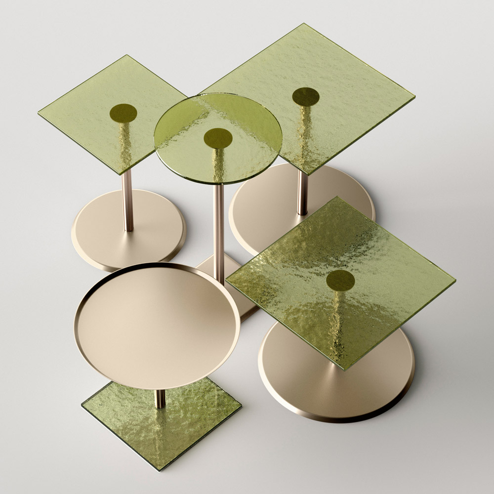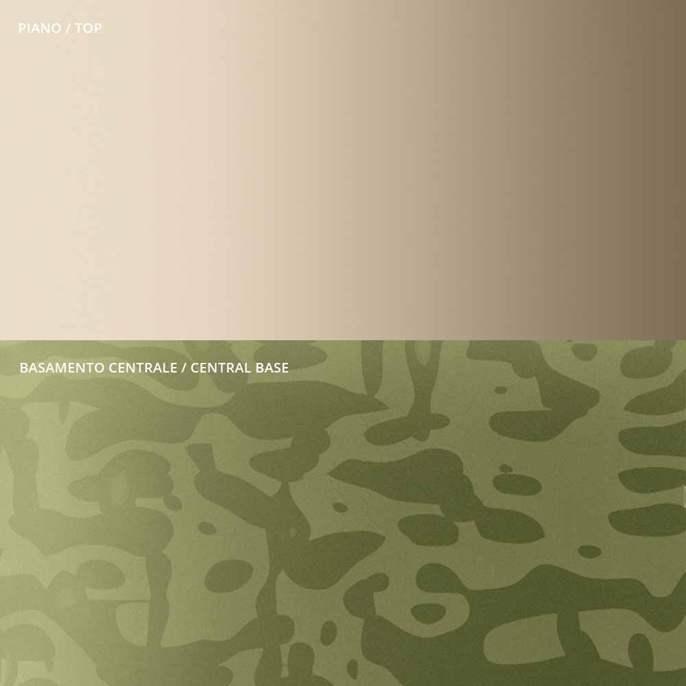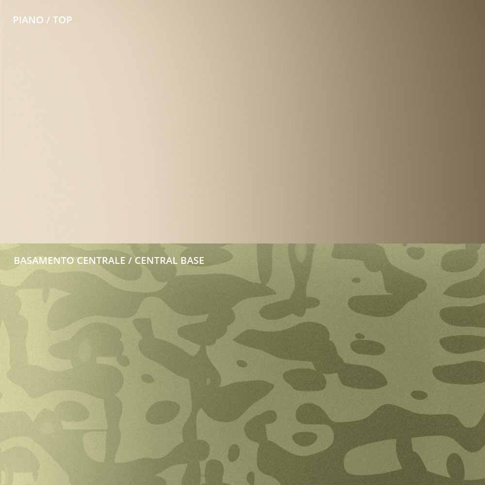 la originalidad y elegancia de las formas del plano y de la base que realzan el detalle del pie central de metal, cuidadosamente torneado en espesor y acabado en la superficie. La mesa de centro, sola o en grupo, se adapta para amueblar cualquier estancia del hogar y contract con un