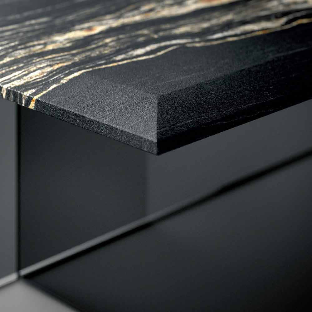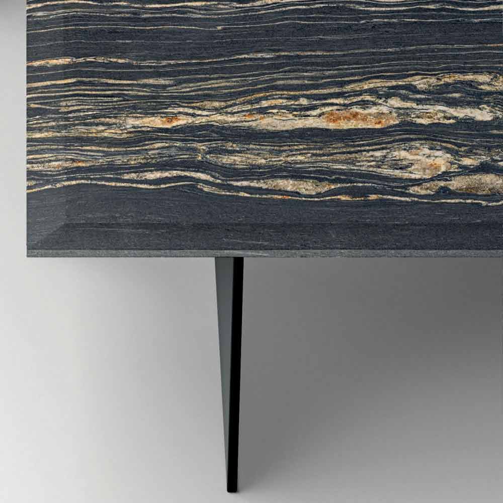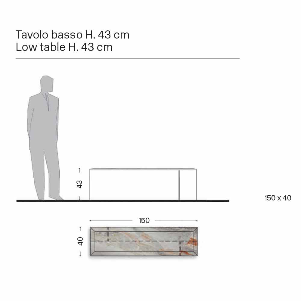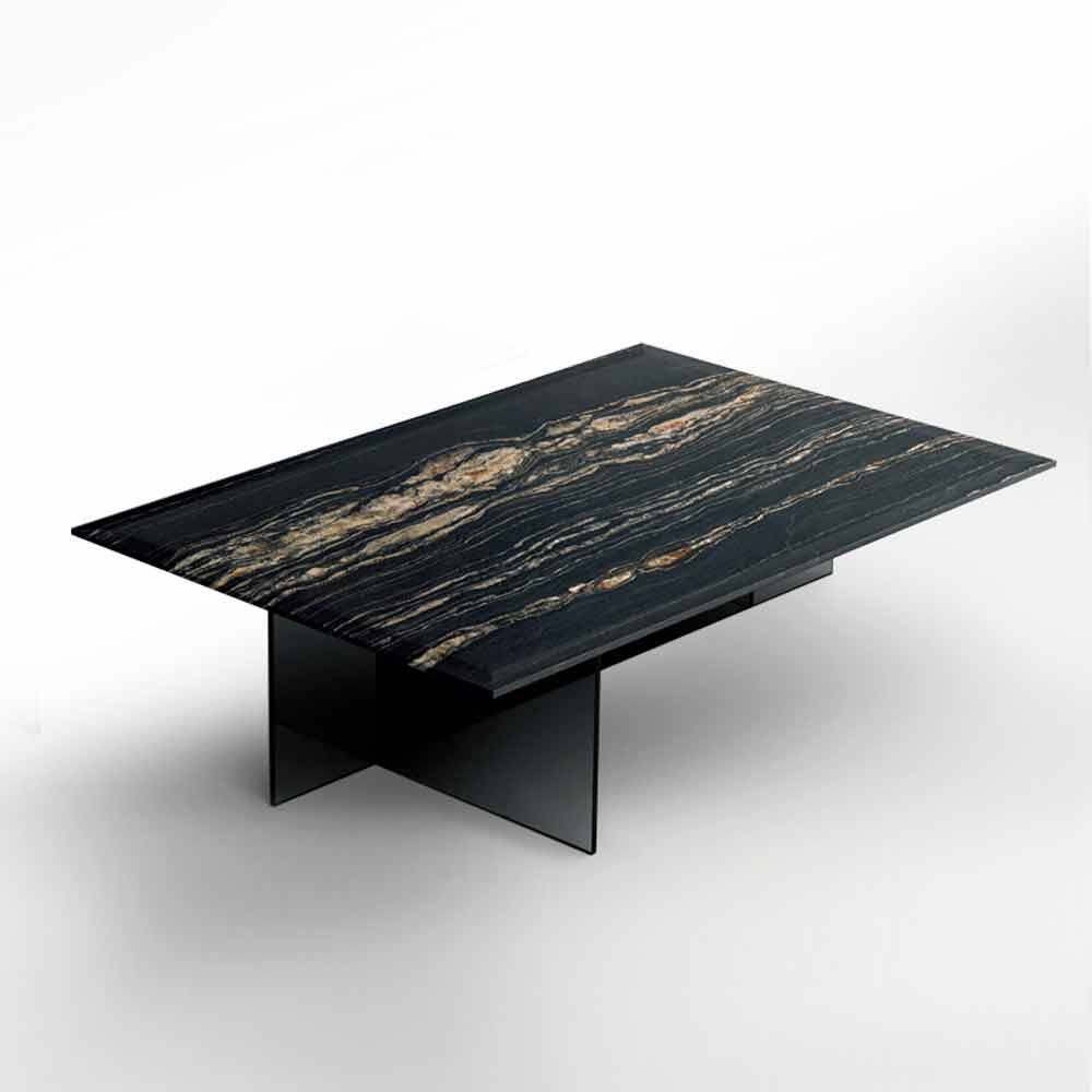 Mesa de centro en mármol biselado con base de cristal de diseño Made in Italy.