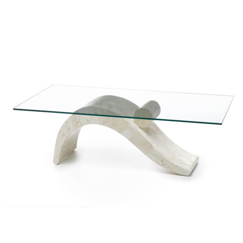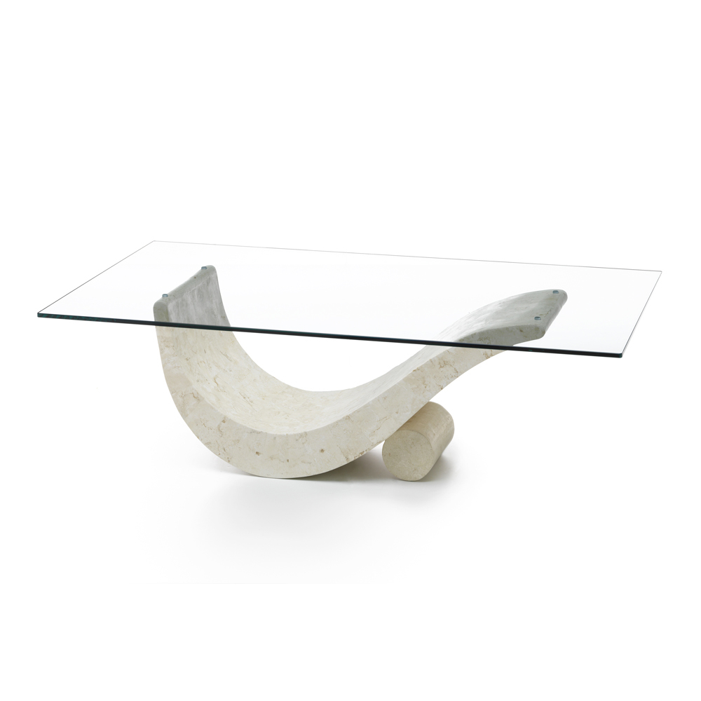 Tiene una estructura realizada en piedra fósil con acabado en ágata blanca y tapa en cristal templado transparente pulido de 10mm.