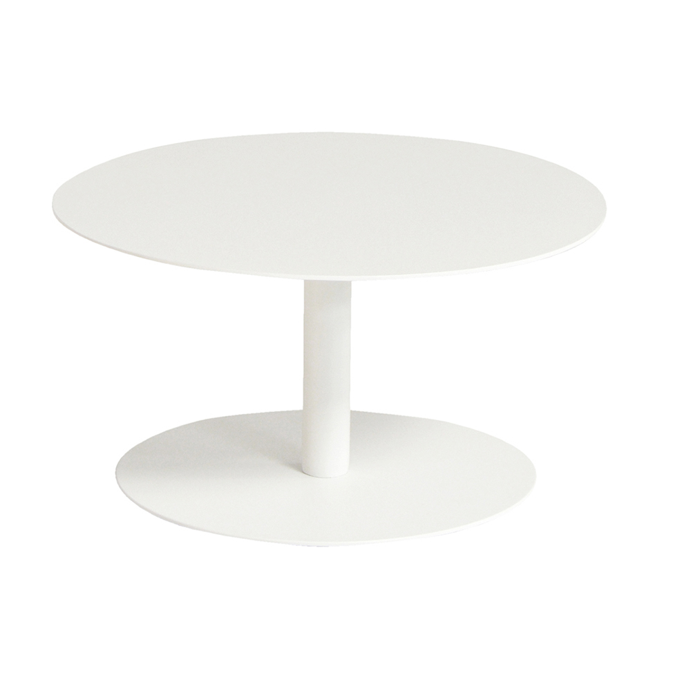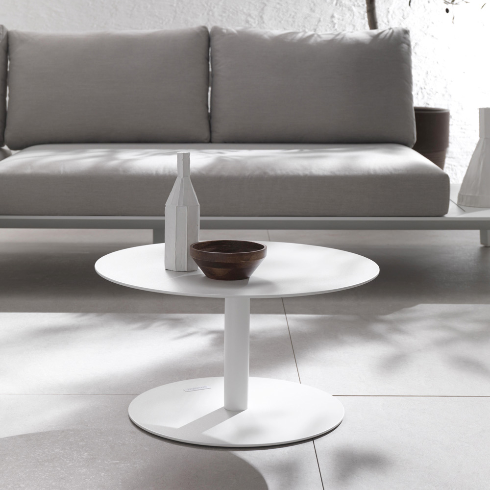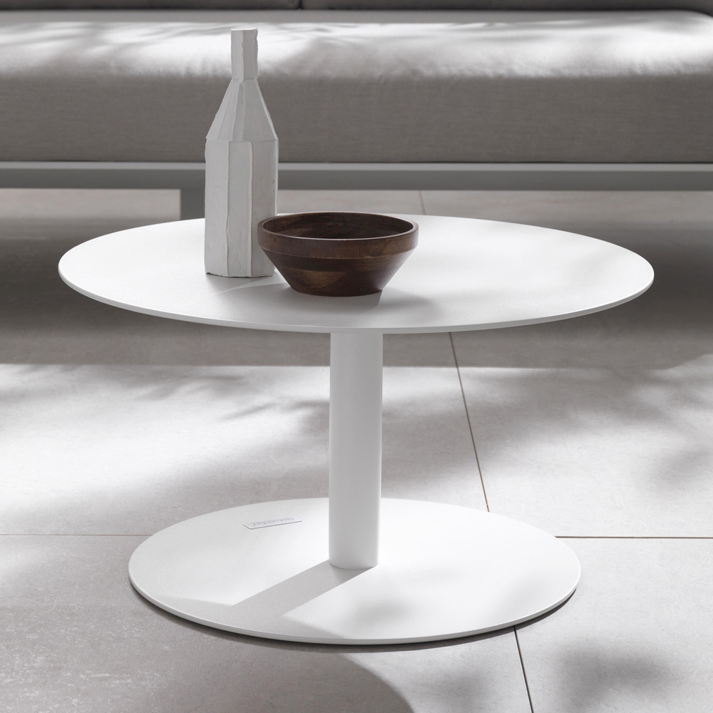 Mesa auxiliar para jardín compuesta por tapa y estructura en aluminio pintado con polvos epoxi en color blanco. Caracterizada por un diseño suave, lineal y sencillo, esta mesa de centro es perfecta para amueblar cualquier ambiente exterior como terrazas, piscinas y jardines, al mismo tiempo que encuentra su lugar en las distintas zonas de estar interiores como punto de apoyo funcional.