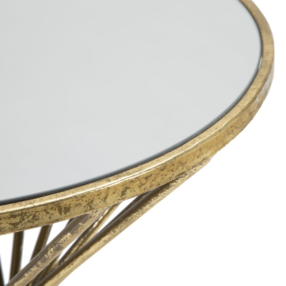 Mesa de centro en hierro dorado con tapa de espejo redondo.