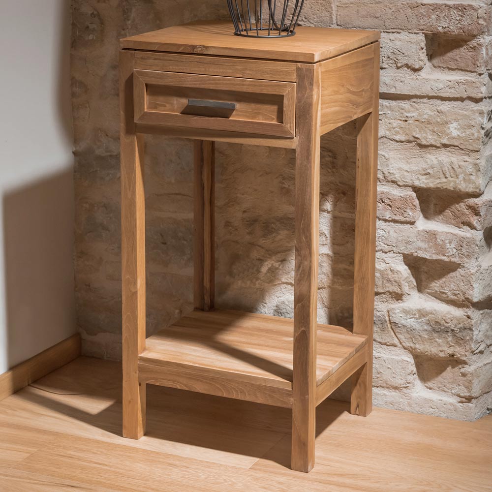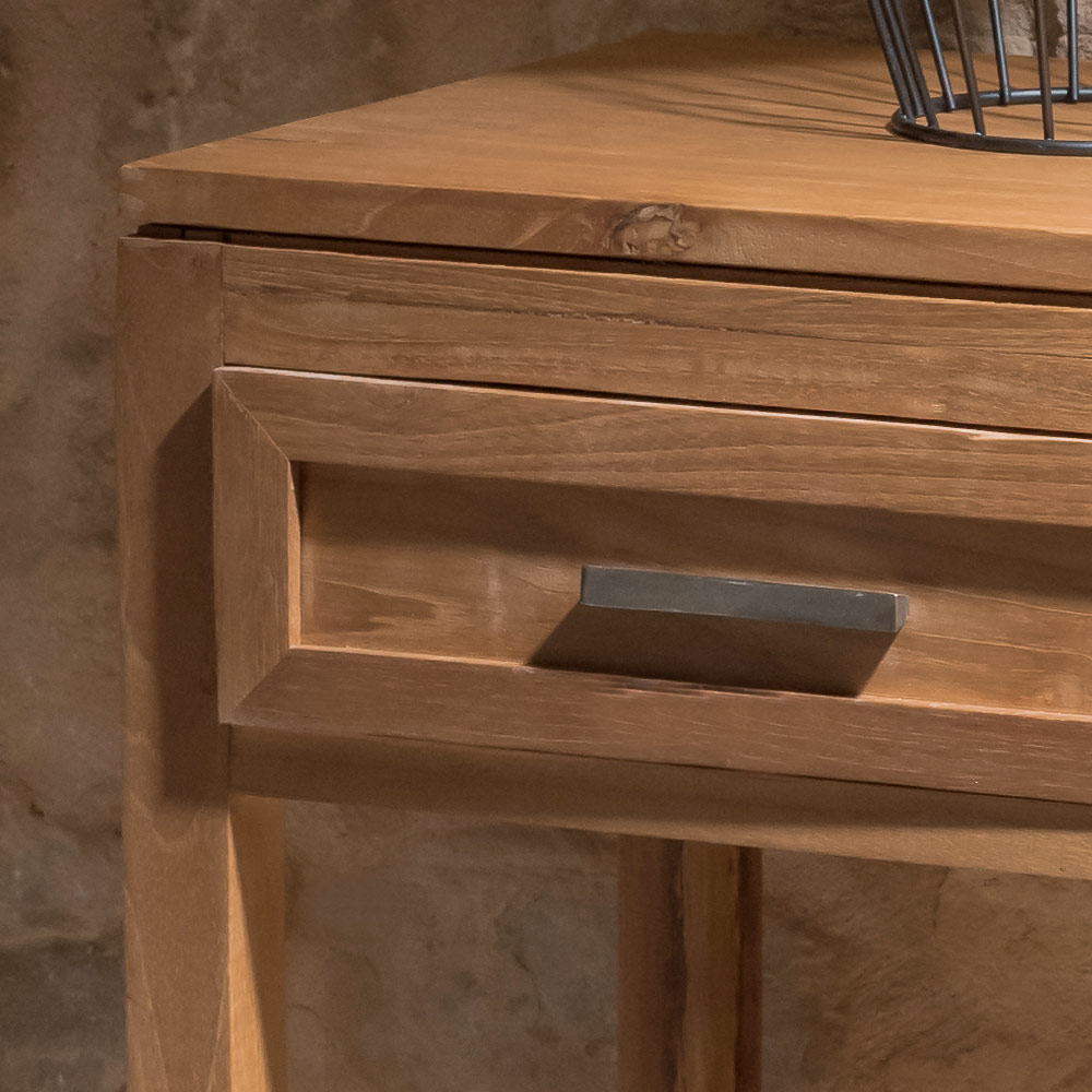 Esta mesa de centro de teca maciza es un mueble compacto y versátil, ideal como mesa auxiliar, mueble auxiliar o mesita de noche. Su artesanía y las vetas naturales de la madera le otorgan un aspecto auténtico y atemporal, perfecto para cualquier estancia del hogar.