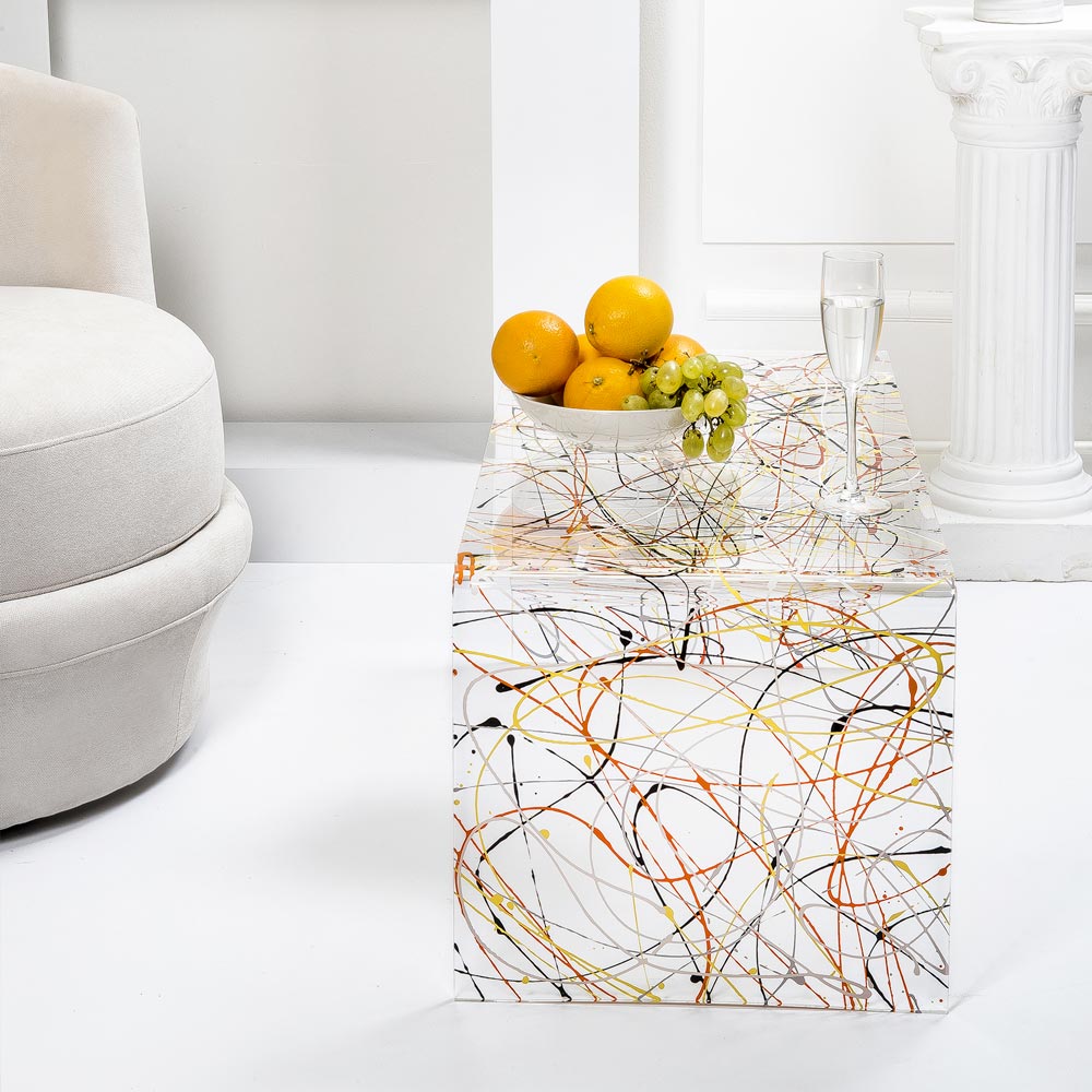 Mesa de centro concebida, diseñada y fabricada en Italia mediante el uso de materiales innovadores y de calidad como el plexiglás transparente con decoraciones multicolores , ideal porque no es tóxico, es hipoalergénico, inodoro, antibacteriano y 100% reciclable. Esta mesa de centro fue diseñada para amueblar el salón o el dormitorio con gusto y funcionalidad, actuando como un elemento de decoración moderno, sencillo y versátil .