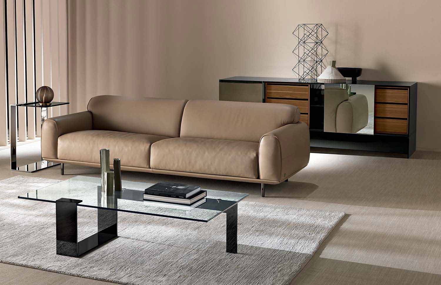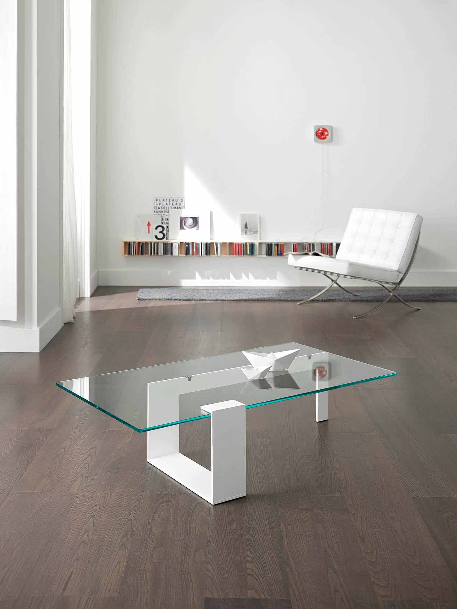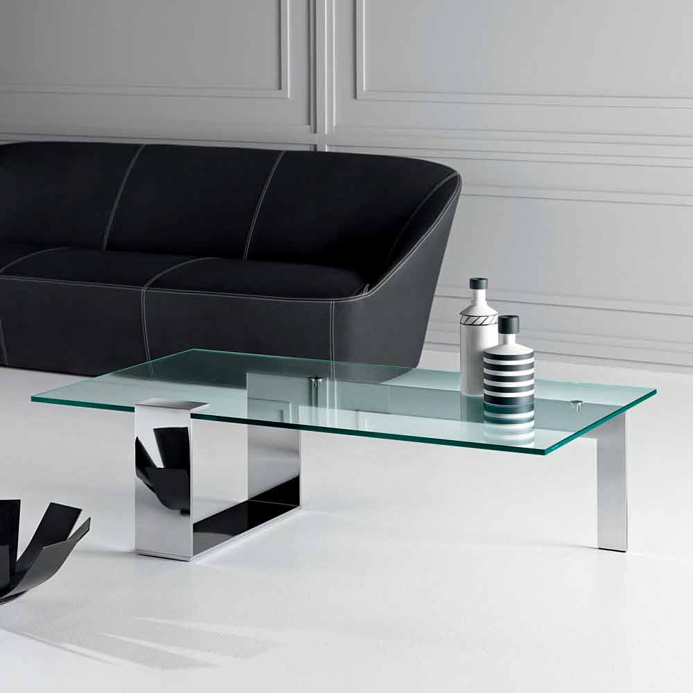 Mesita baja de diseño moderno con sobre de cristal extra claro y base de metal, fabricado en Italia.
