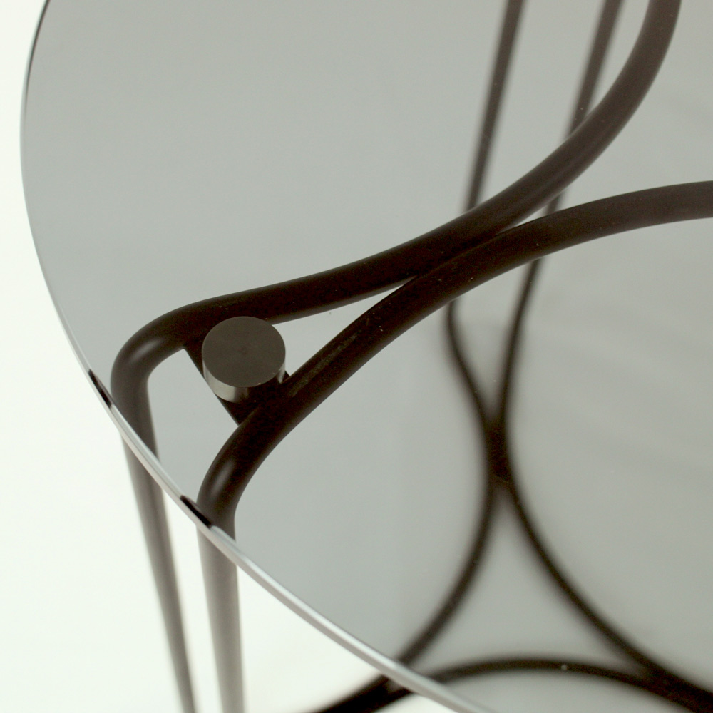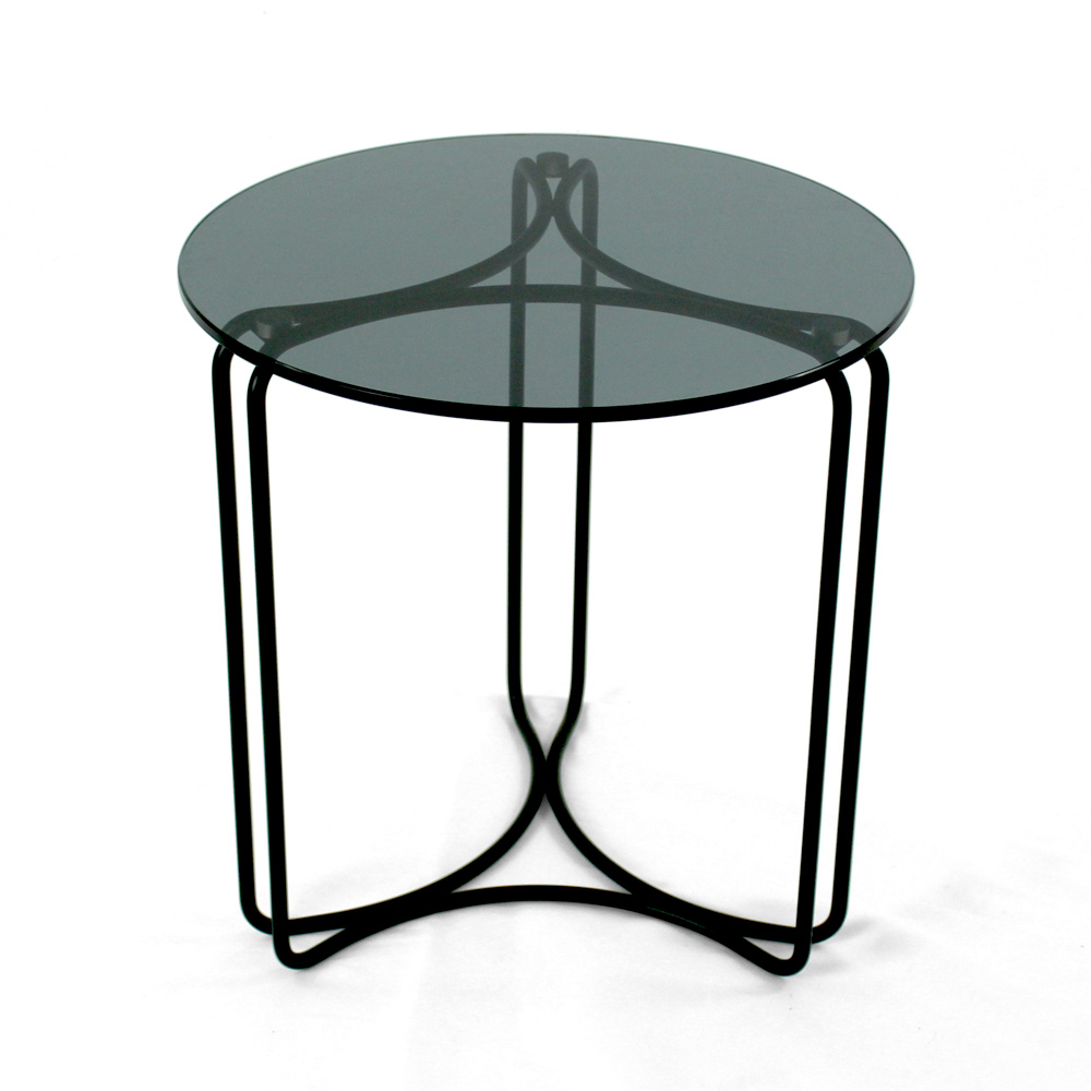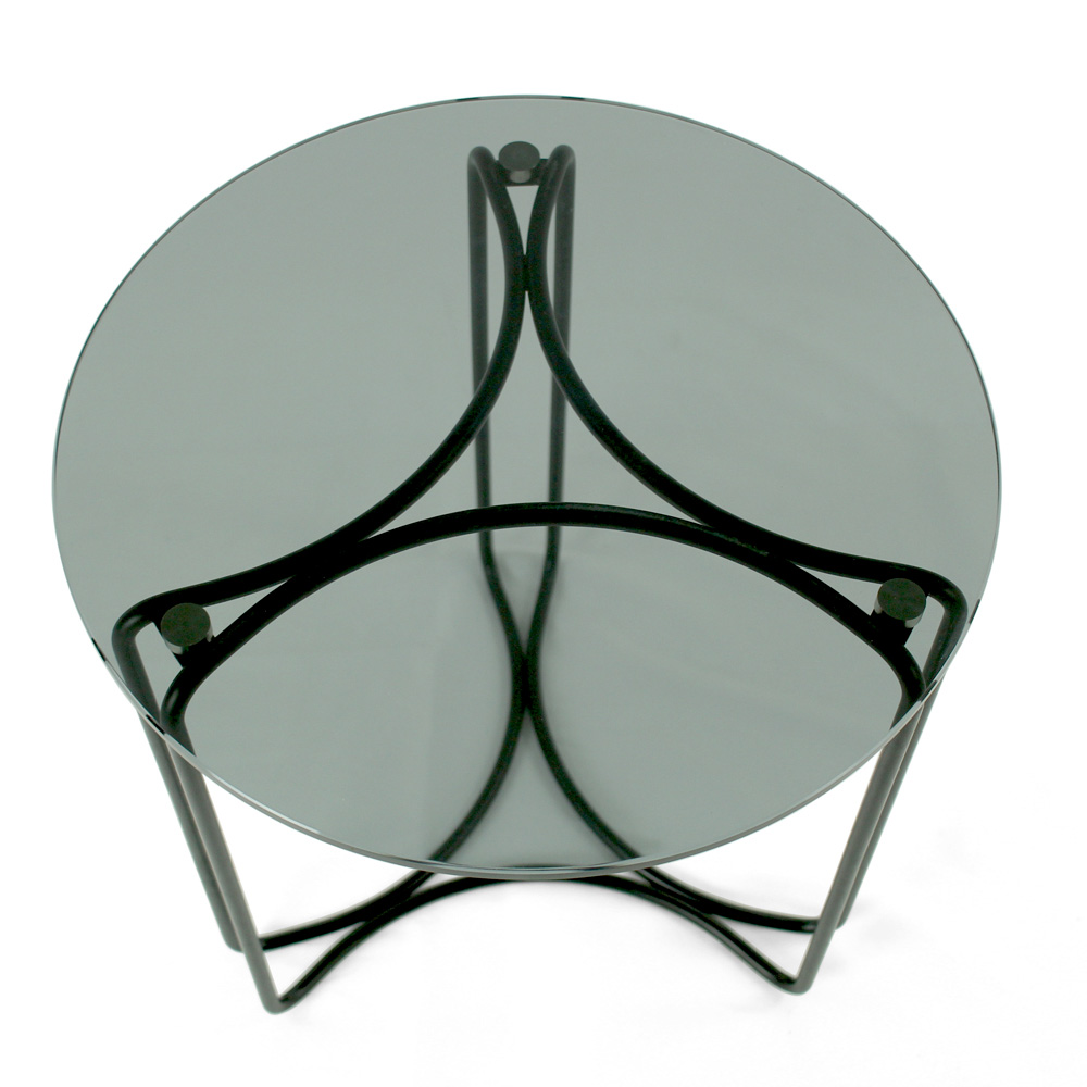 Mesita redonda con base de acero pintado y tapa de cristal.