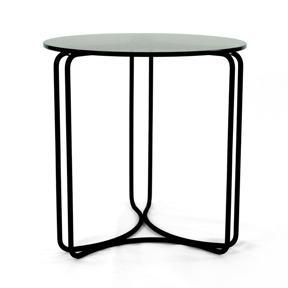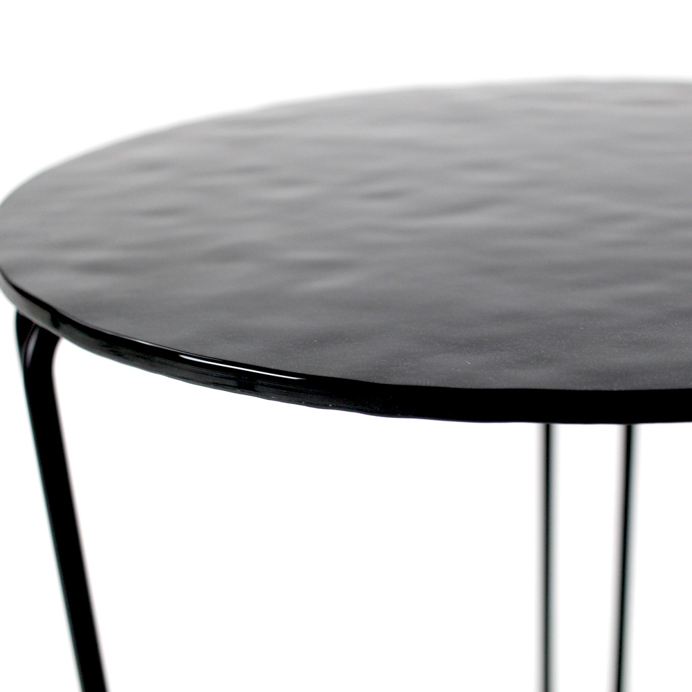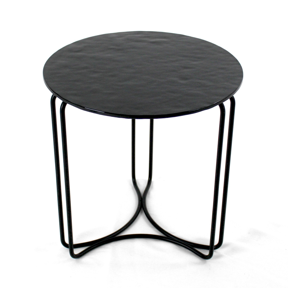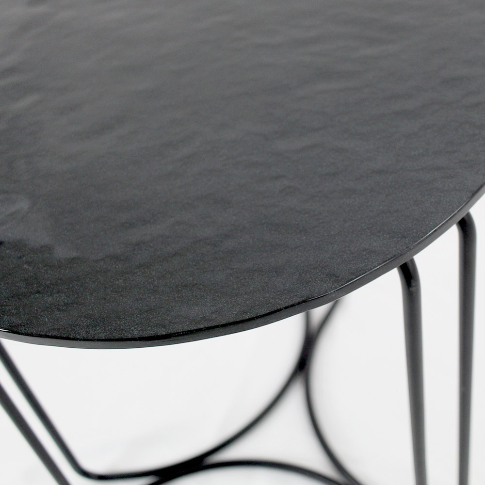 Mesita redonda con base de acero pintado y tapa de cristal.