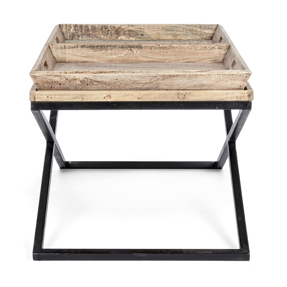 Mesa de centro en acero y madera de mango con bandeja, 3 medidas.