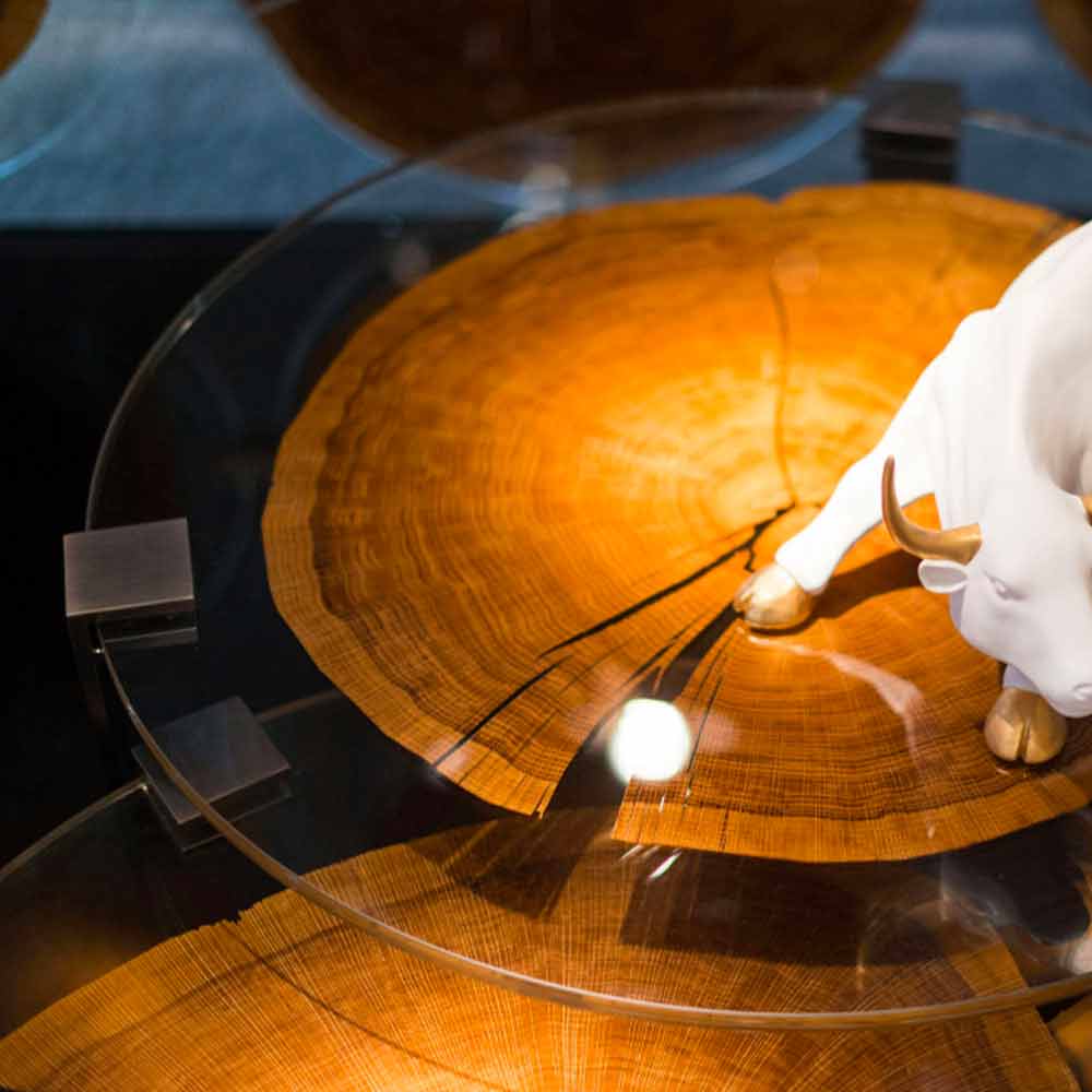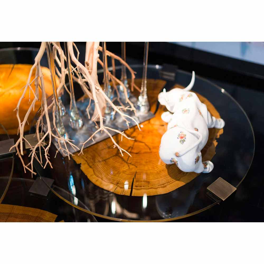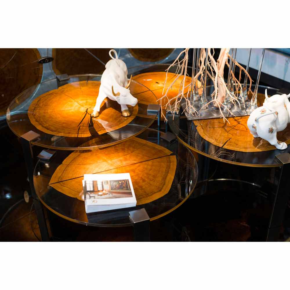 Mesa de centro hecha en Italia con tablero redondo de vidrio acoplado (5 + 5 mm) en cuyo interior se inserta un delgado trozo de madera cortada , sostenida por 3 patas metálicas con acabado en latón bruñido . De la combinación exclusiva del toque refinado del vidrio, los maravillosos colores de la madera y la estética moderna del metal, nace una solución de decoración única que basa su idea en conceptos de innovación y elegancia para un resultado vanguardista con una fuerte personalidad. contemporánea . Su fuerza está representada por la combinación perfecta de acabados y materiales que aumentan el valor de la mesa de café sin descuidar nunca el aspecto funcional fundamental subrayado por la mano de obra 100% Made in Italy y el uso de materias primas de calidad, lo que permite ofrecer un accesorio de decoración. con una belleza revolucionaria y al mismo tiempo particularmente sólida y resistente .